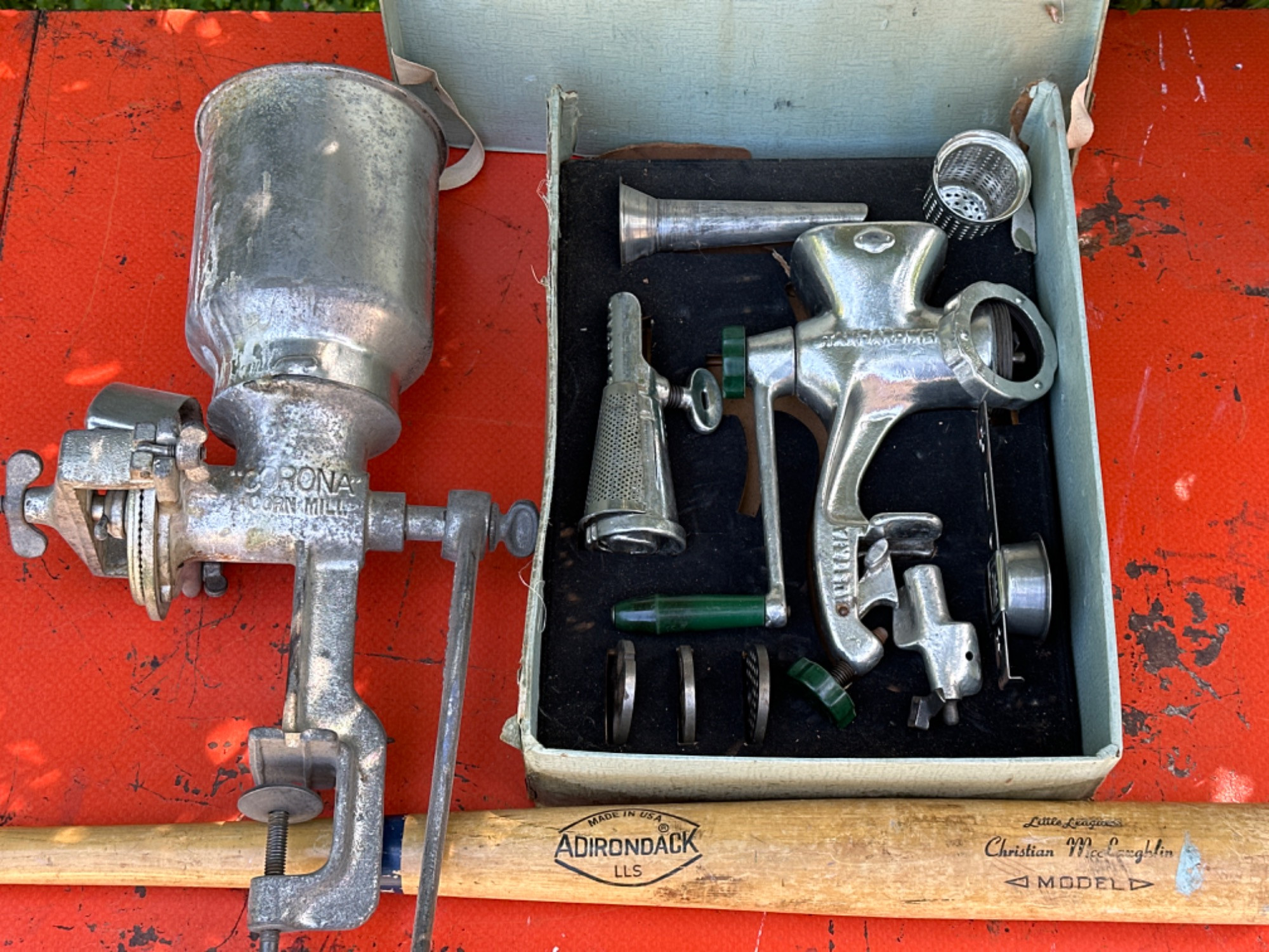 Vintage Corona Corn mill is approximately 18 inches tall Standard Werk Austria multi mill - box measures 15 x 11 x 3.5“ In original box, all attachments appeared to be in place and in good working condition Vintage Adirondack bat is approximately 30 inches long