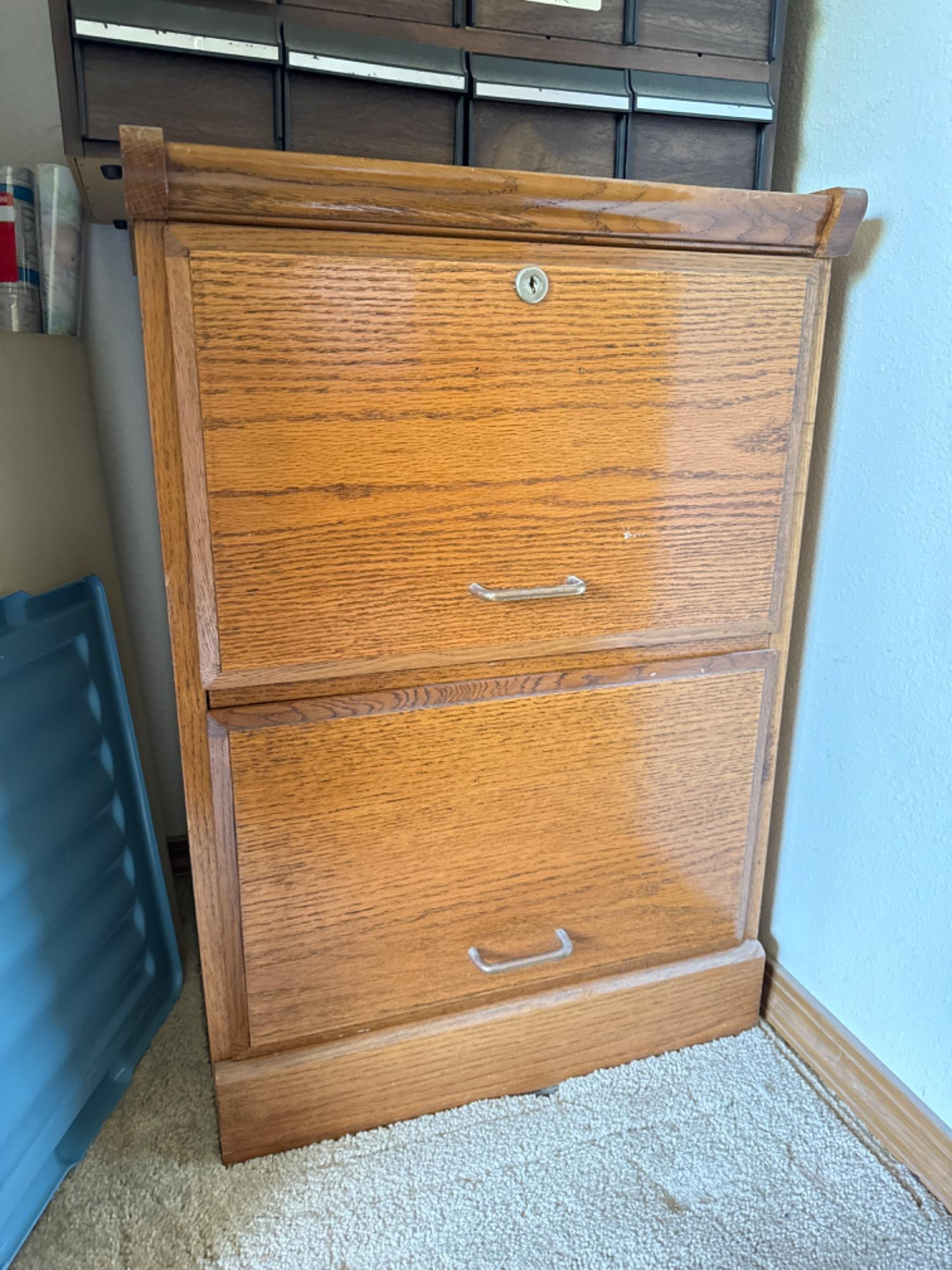 Vintage Solid Wood w/ Veneer Filing Cabinet Appears to be in good condition. 17 inches deep by 19.25 inches wide approximately 28 inches tall no key