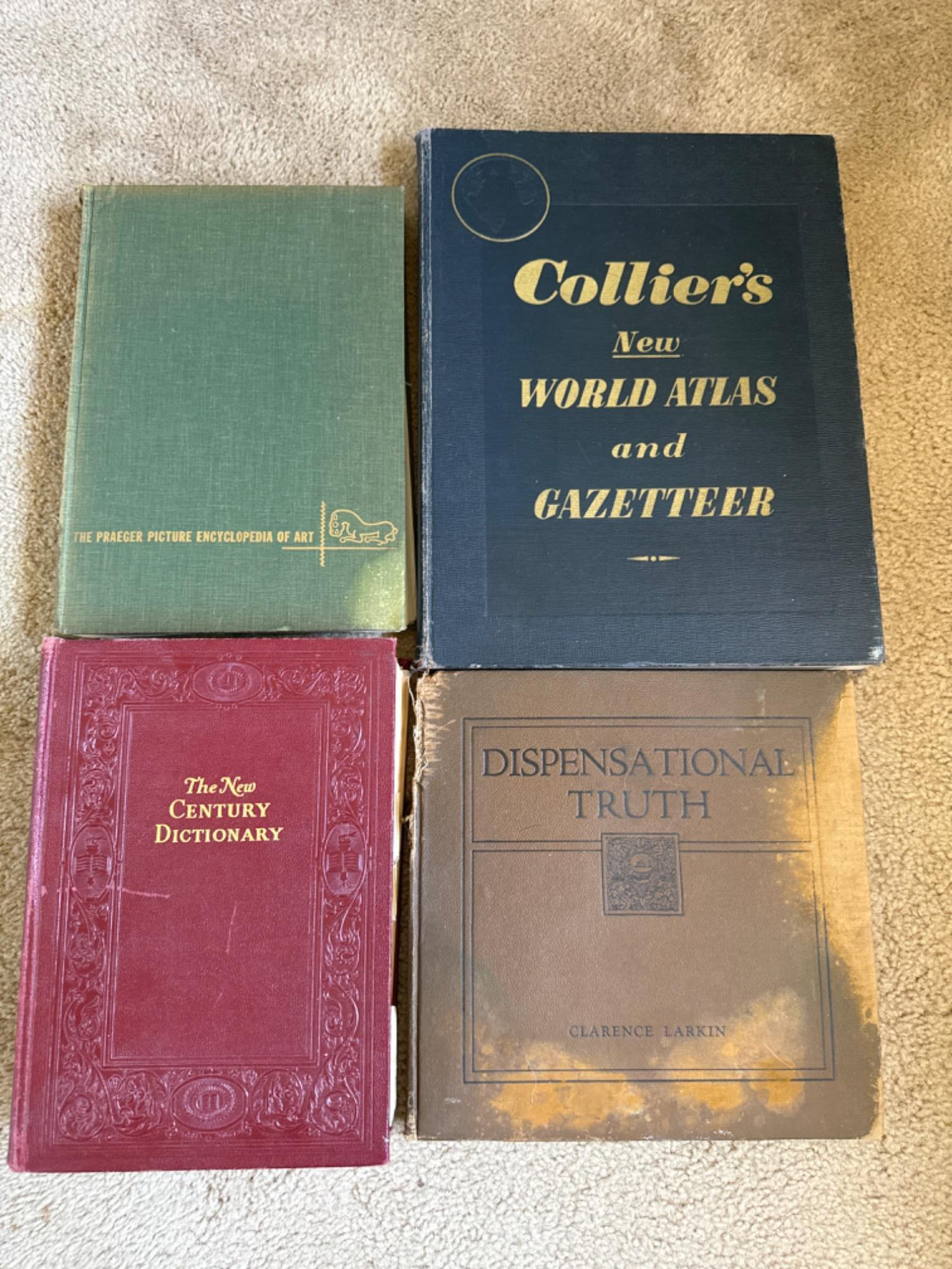 Vintage Hardcover Book Quartet Dispensational Truth - water damage 1946 New Century Dictionary 1953 Colliers New World Atlas and Gazetteer 1958 The Praeger Picture Encyclopedia of Art