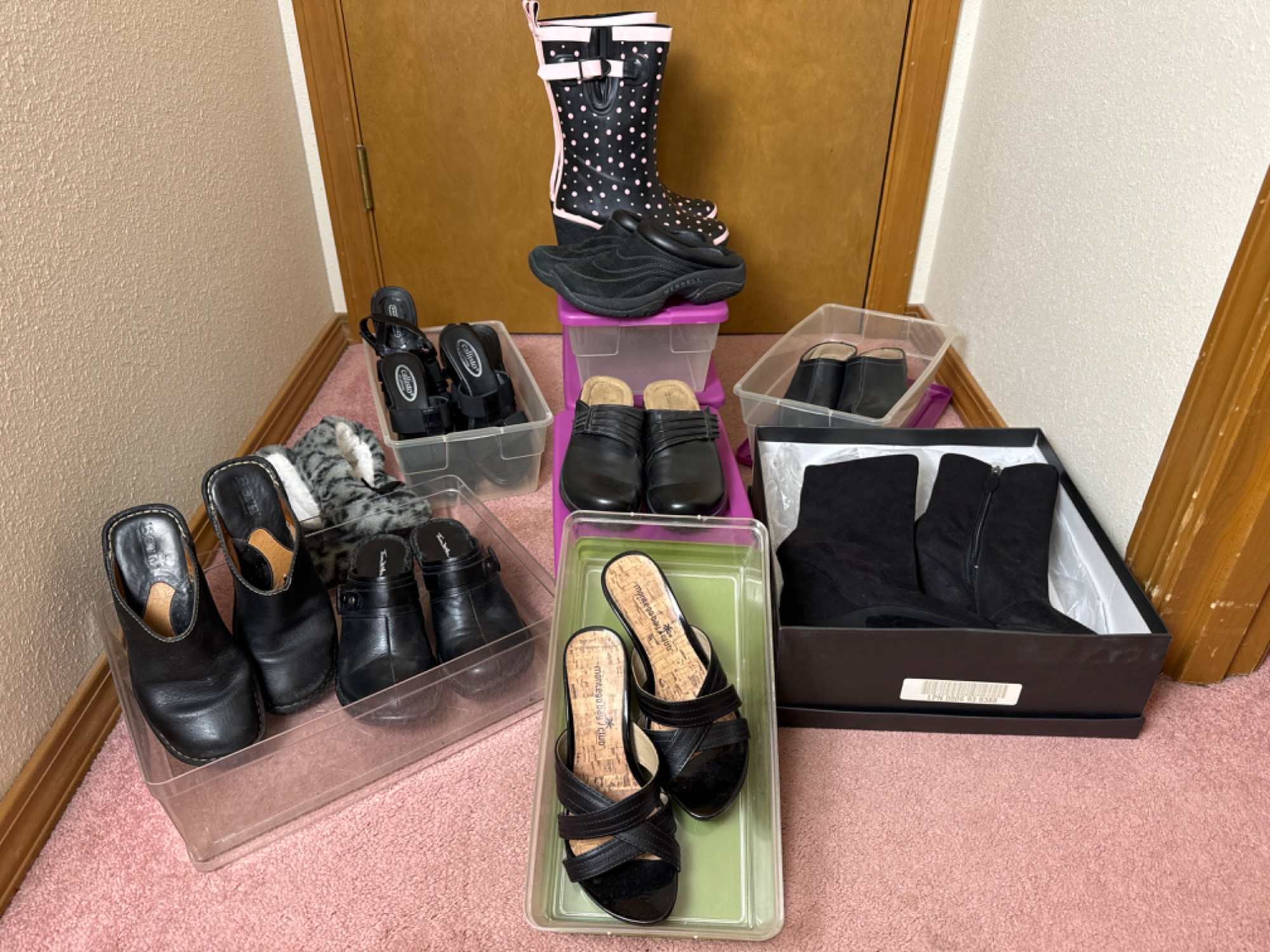 Modern Women's Black Shoes - Size 5&6 Montego Bay Club and Just Fab are new in box Born has damage to base of one and repair on the other r (2) pairs of Merrell MOCs - Size 5 is like new, Size 6 has wear Majority of the items are size 6 Plastic cases included