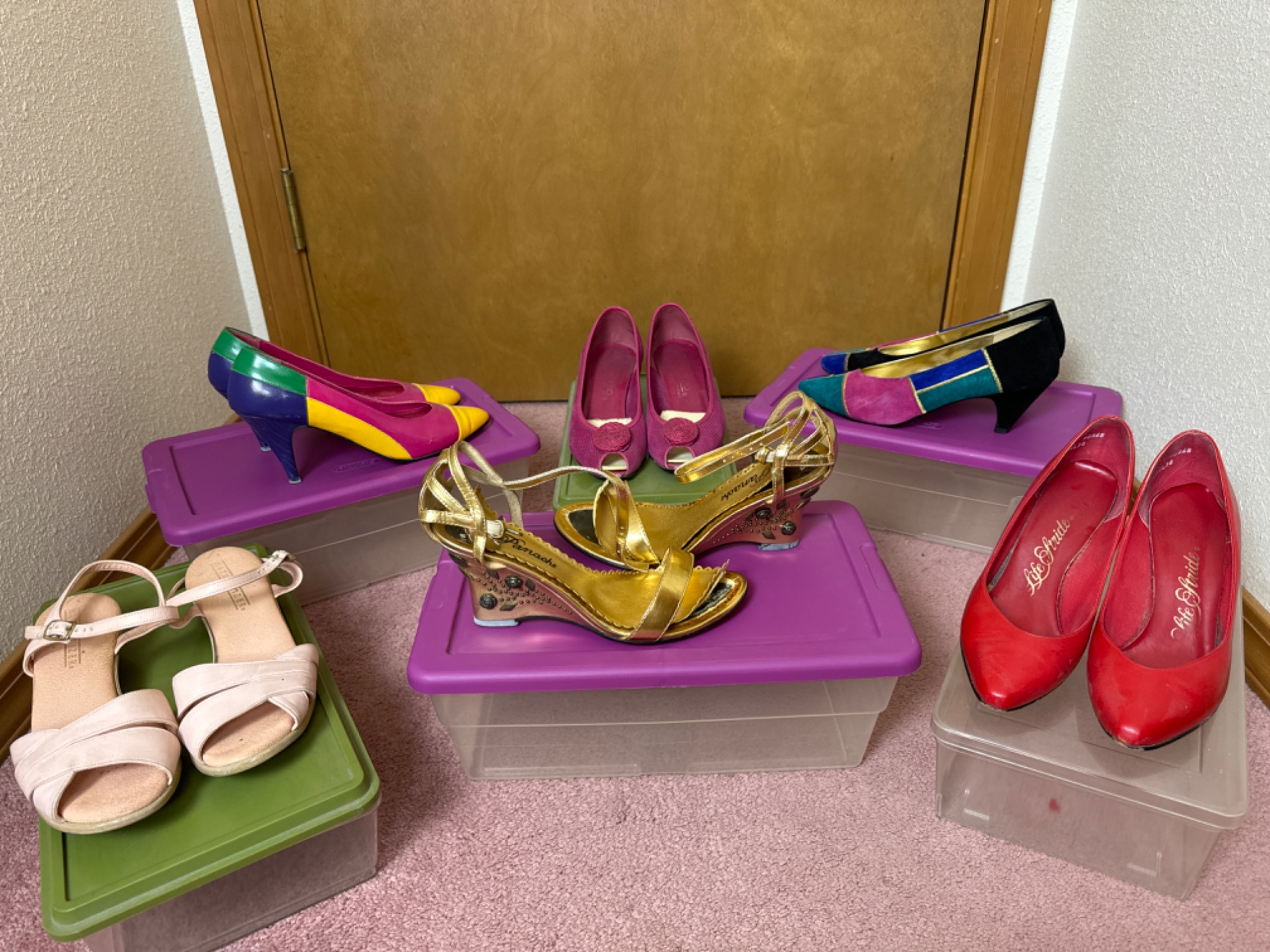 Vintage Shoes sizes range from 5-6 Strappy Gold Panache Wedges Sz 5.5 - do not have wear, needs some regluing New Direction Color Block Pumps Sz 6 1980’s Ellemenno SUEDE color block pumps Sz 6 Some will need repairs Plastic cases included