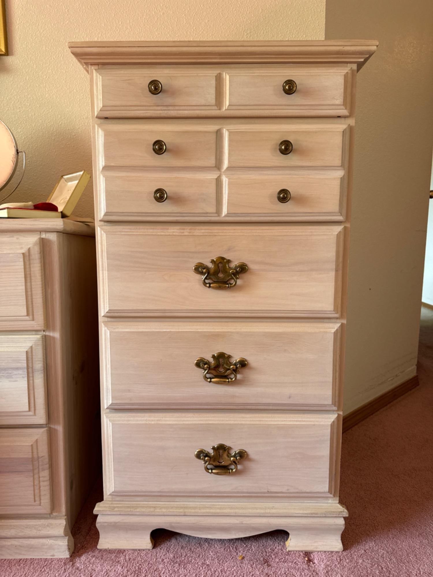 White Washed Solid Wood Lingerie Chest Measures 42.5 inches tall by 17.25 inches deep by 23.25 inches wide Made out of solid wood w/vintage knobs Some discoloration to the top Bidding on this lot is an agreement that: (1.) You