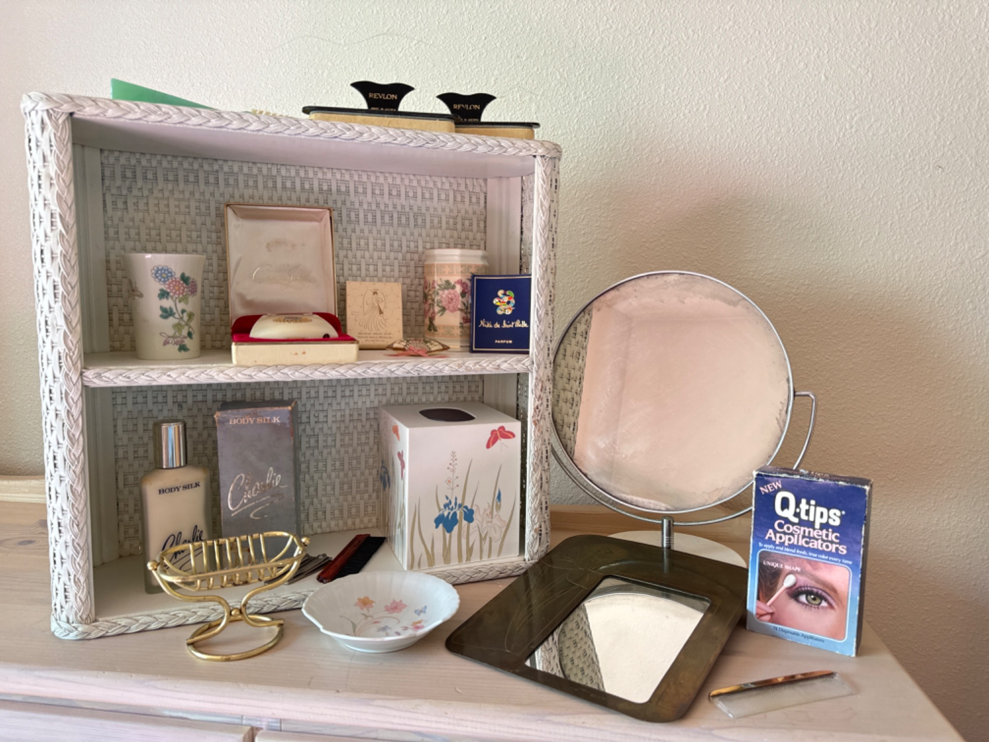 Wicker cabinet or shelf unit 18.5” x 6” deep x 17.5"T - only one minor issue with the weaving coming undone - could use a new coat of paint Brass Mirror with etched daffodil Art Deco mirror with wood block base The Crown Jewel from Schick in original case, has cord New old stock White Shoulder Cologne - looks full
