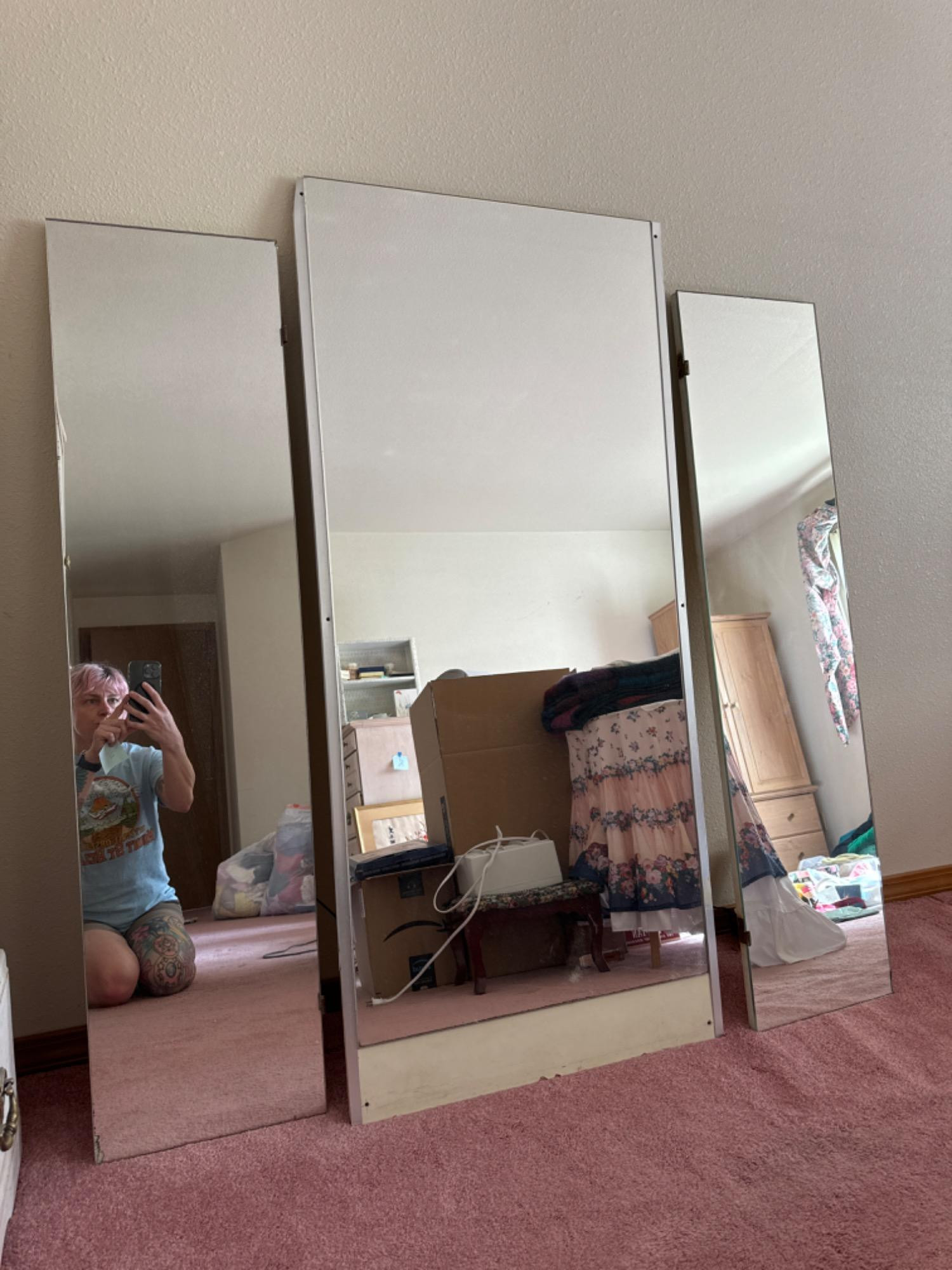 Retro Mirror Trio Once part of a vanity. Put them back together or enjoy separate Minor mirror deterioration on the left panel Main mirror 51.5” x 23.25" These are heavy!