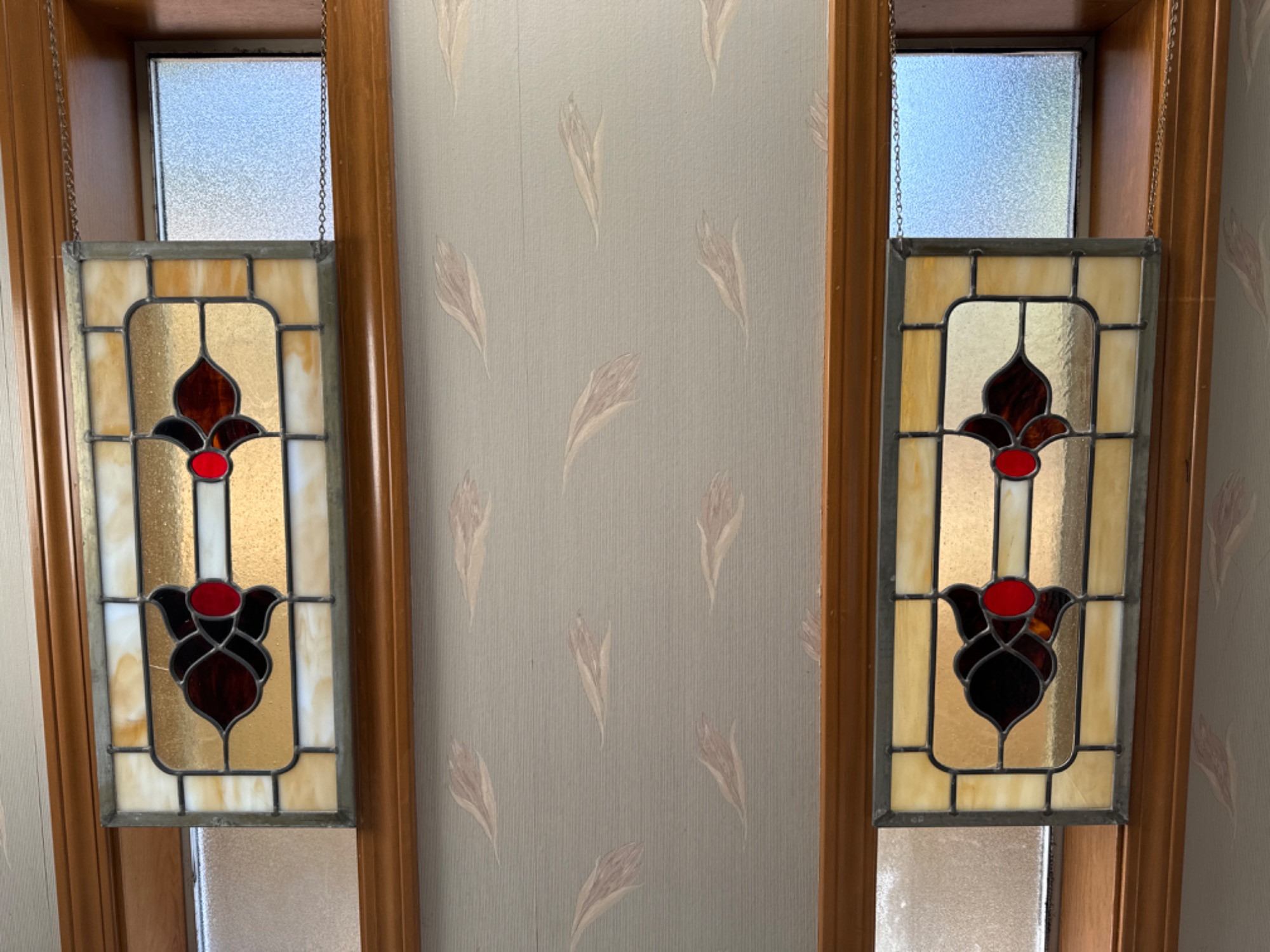 Stained Glass Panels Measures: 24 x 10.5: Hung on 12 inch chains only one small flaw in a pane - see last photo