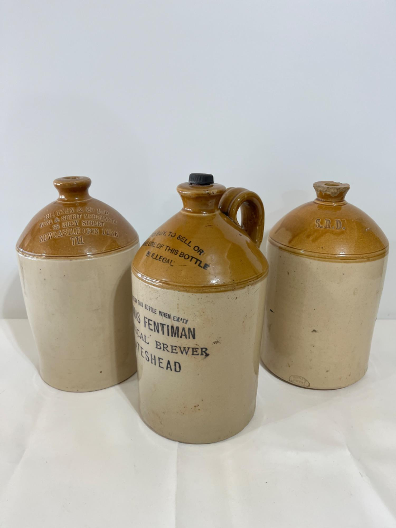 - Large Antique Liquor Stoneware Jug Set. - Set of 3. - Thomas Fentiman branding on one. - Thomas Branded jug: 6.75" Diameter x 13" Height - Other jugs: 7.5" Diameter x 13" Height