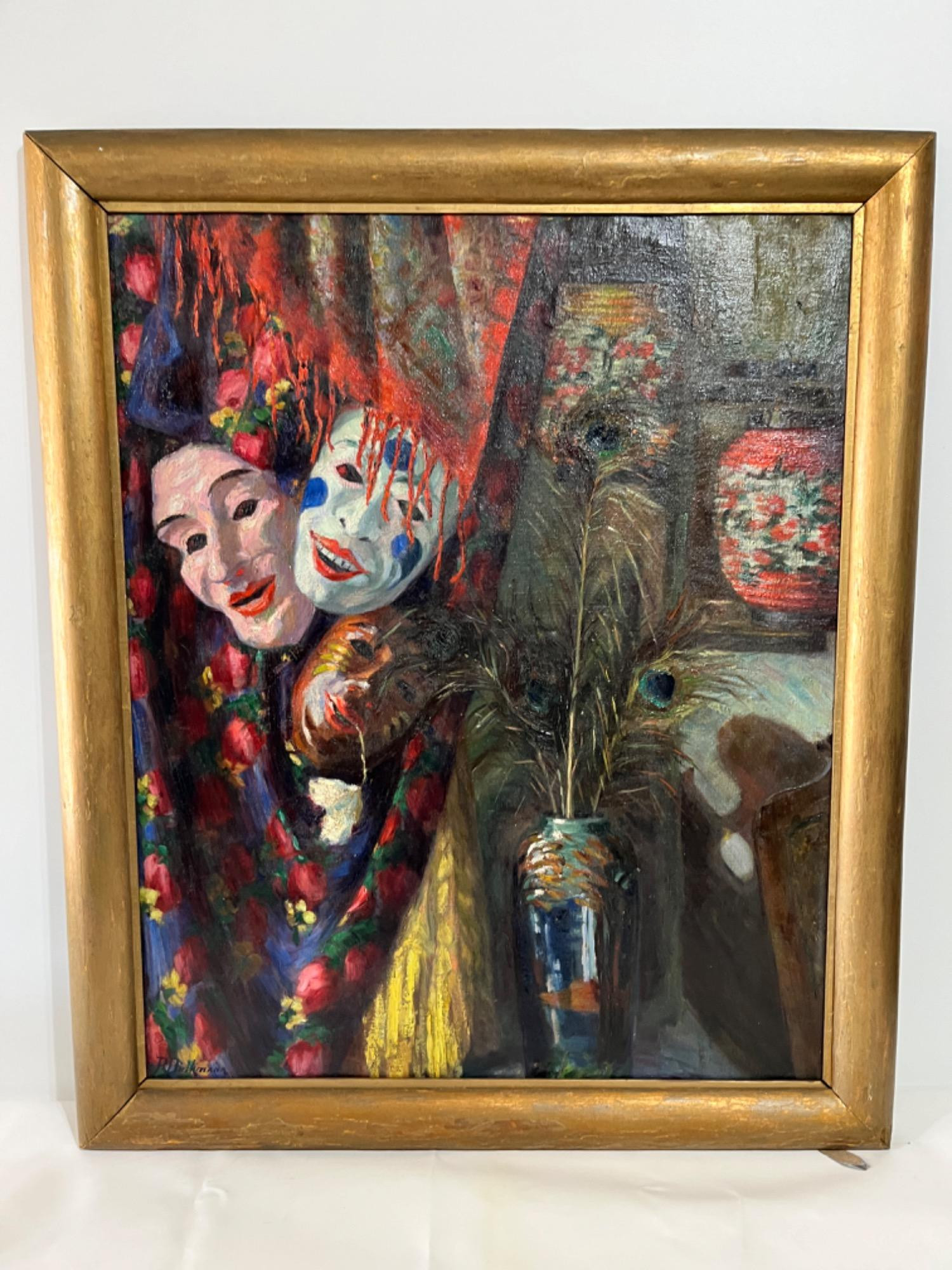 - Original, vibrant painting featuring two expressive masks set against a colorful background with floral patterns and ornate vases. - Signed by artist. - 32" x 36" Sound Estate does not have any certification on this painting nor do we have verification of the authenticity. It does appear to be original (it is an actual painting). The bid starts at $5.00 and we leave it up to the bidder to do their homework.