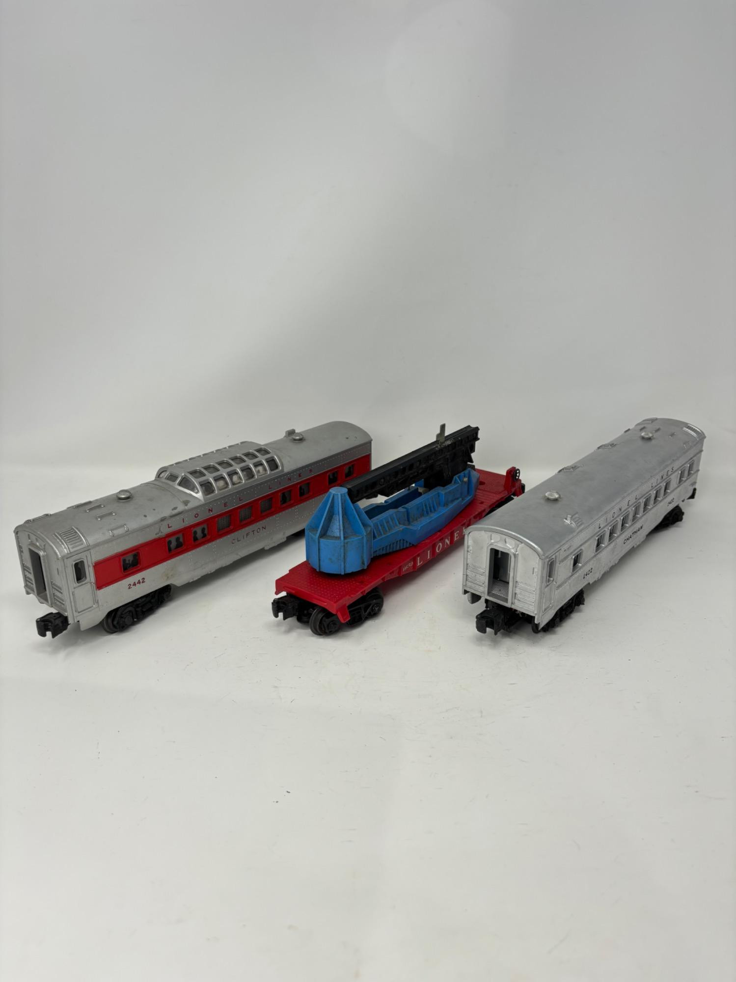 Includes: - Lionel O Gauge Trains Clifton Passenger Carriage No. 2442 - Lionel O Gauge Lines Chatham Passenger Carriage No. 2422 - Lionel Lines O27 Flat Carriage w/Missile Launcher #6650