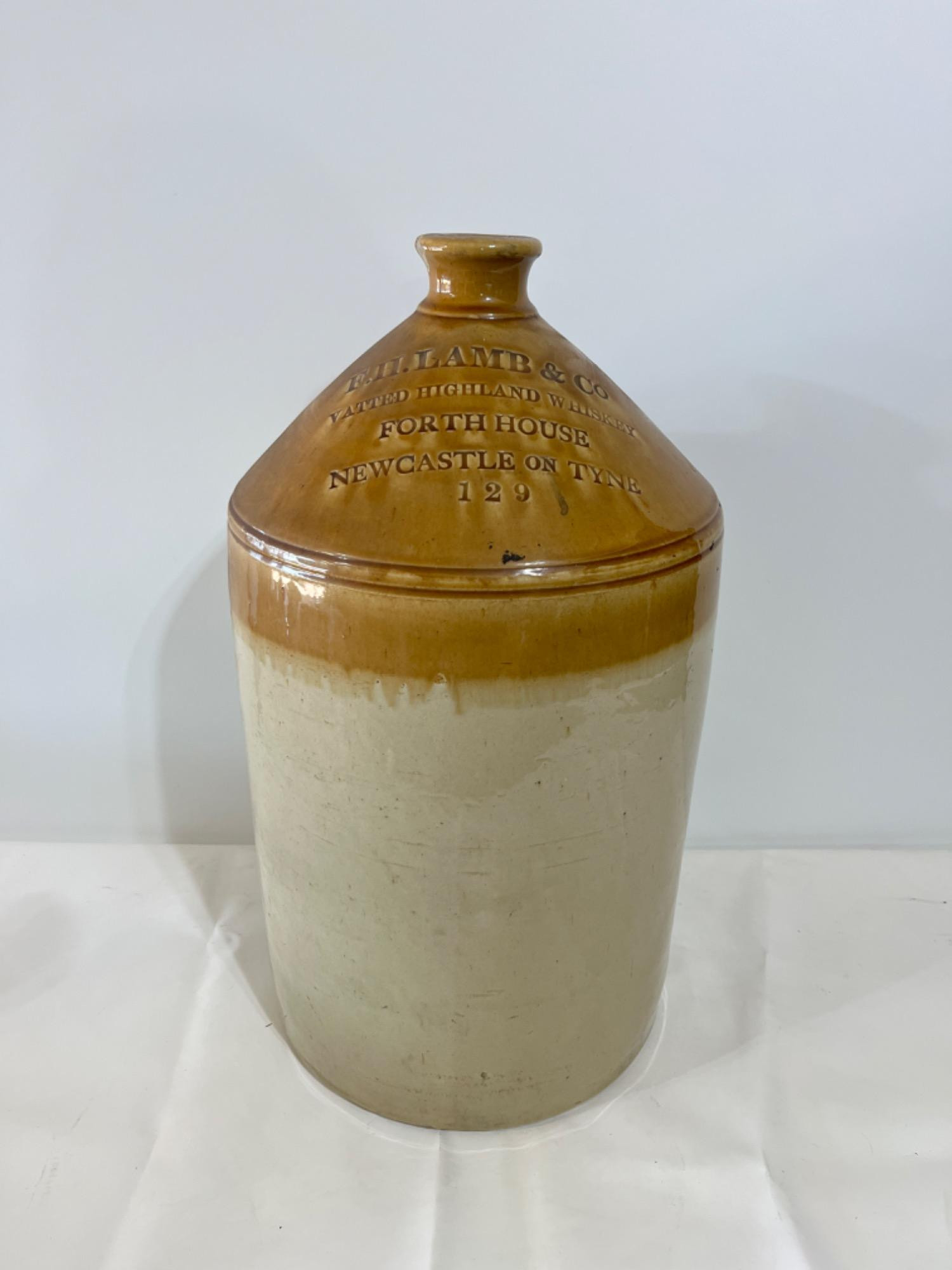 - Stoneware liquor jug with appropriate aging marks. - F.H. Lamb & Co. branding. - 12" Diameter, 24" Height
