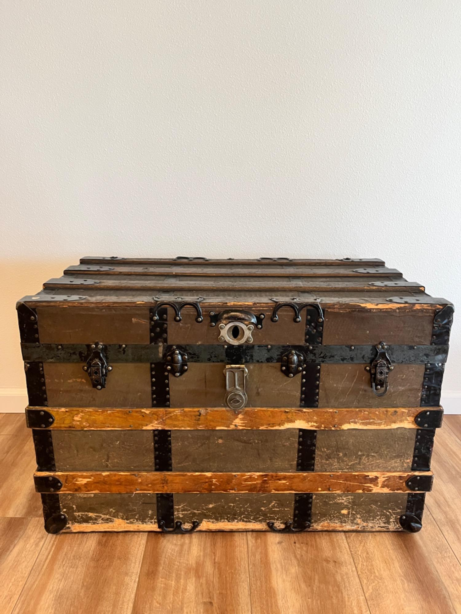- Large antique wooden chest. - James I. Gallacher Manufacturer - Made in Salt Lake City, Utah - Dimensions: 34.25" x 18.75" x 21.5"