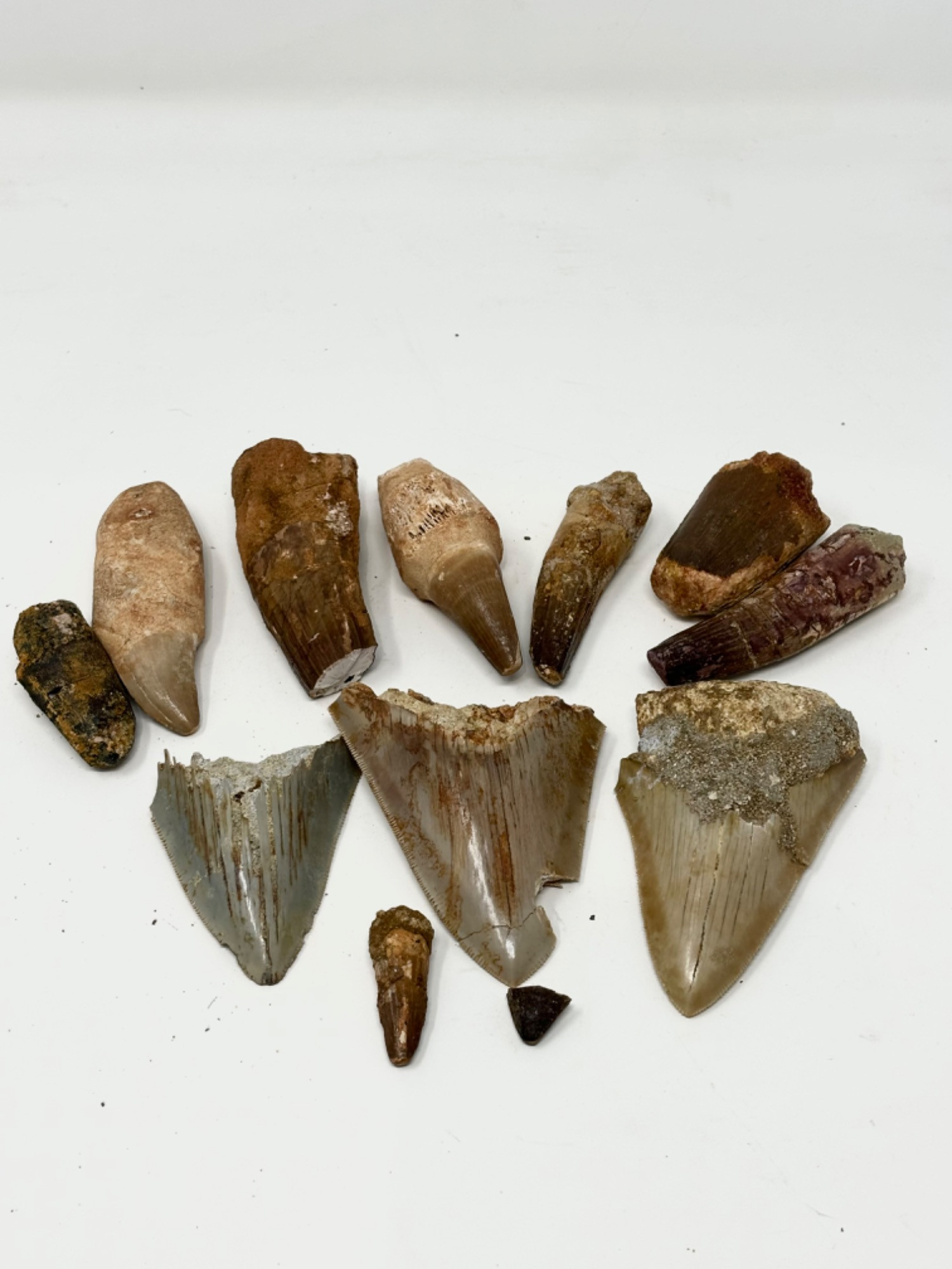 - A collection of fossilized teeth. - Featuring shark teeth and Mosasaurus teeth!