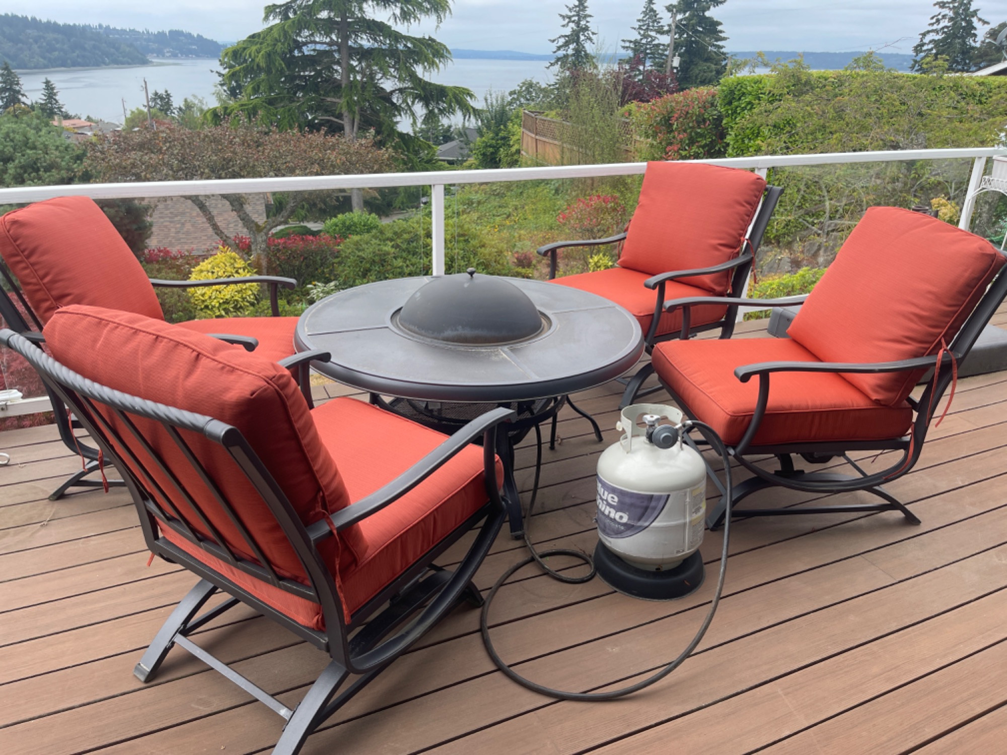 Lot # 17 - Hampton Bay Fire Pit Table and Cushioned Patio Chairs