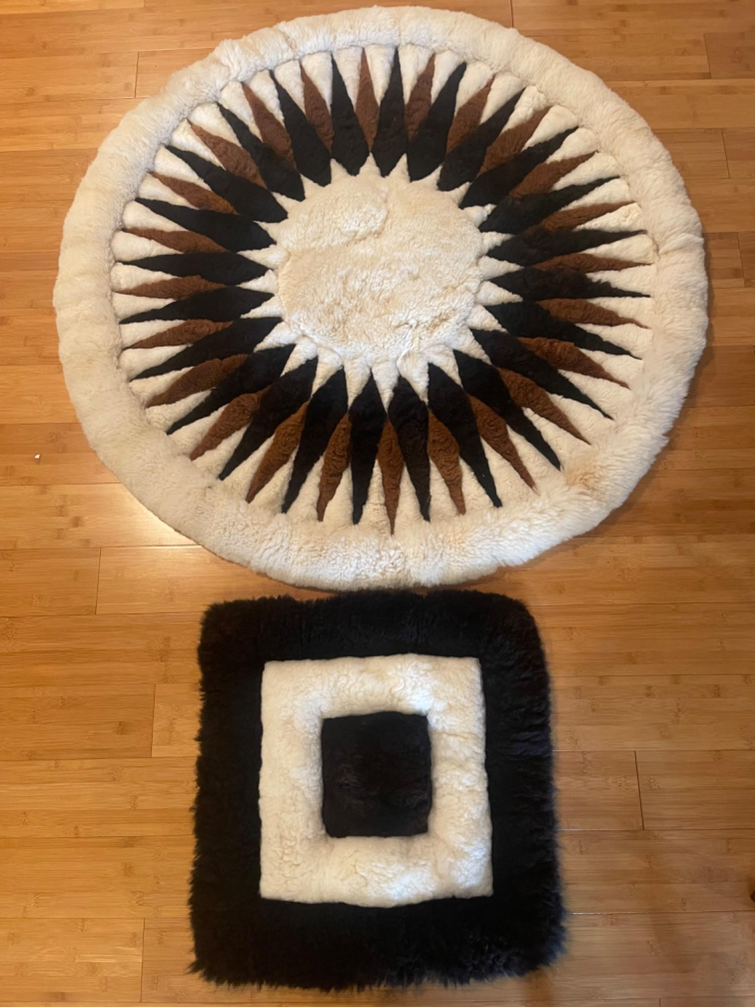 Probably Alpaca fur, but do not know for sure. Both have a couple of very small stains that would likely come out with some good cleaning. Both are in very good condition, stitching and fur on both. Pillowcase: 22 inches x 22 inches Rug/Wall Hanging: 48 inches in diameter