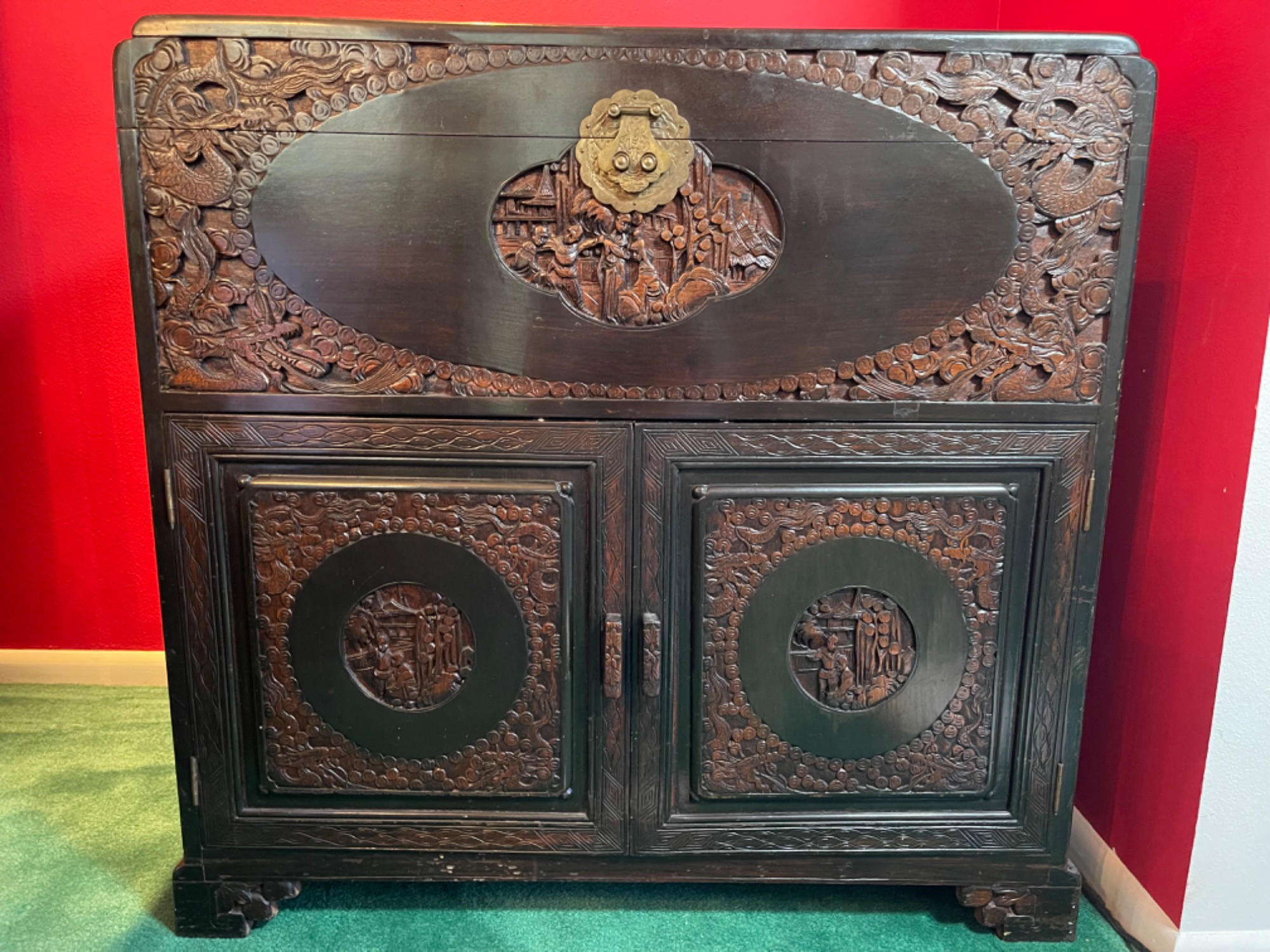 Cabinet doors do not hold fully closed. The mechanism seems to have given out and simply needs some replacing. You can see how they sit slightly open in photos. Trunk has some staining shown in photos as best as possible. Wood also has some cracking - one large one along the side and a couple on top. Show in photos as best as possible. Measurements: 36 inches L x 17.5 inches W x 35.5 inches H