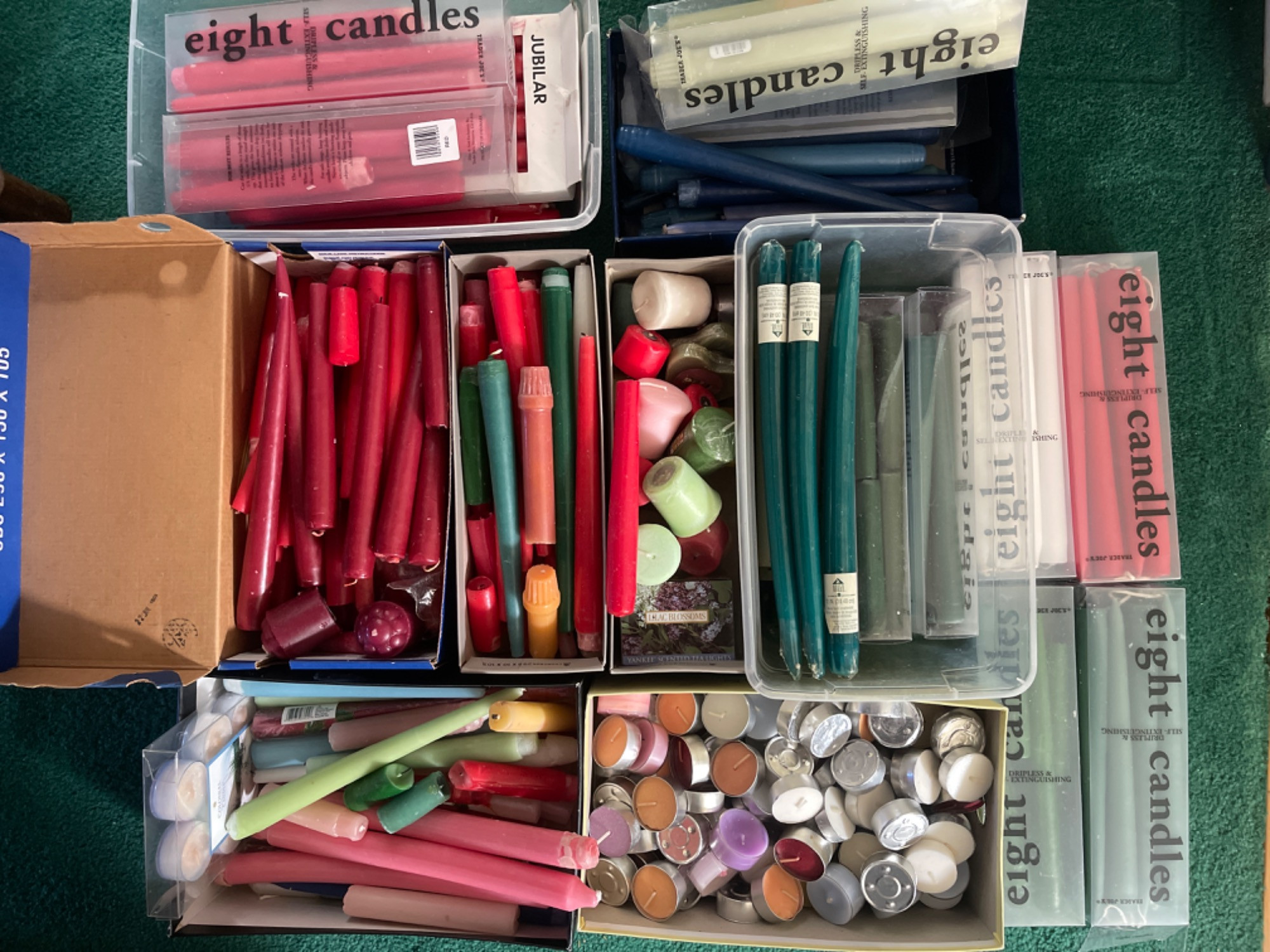 Boxes full! Both tea, lights, and candlesticks both new and used. Scented and unscented.
