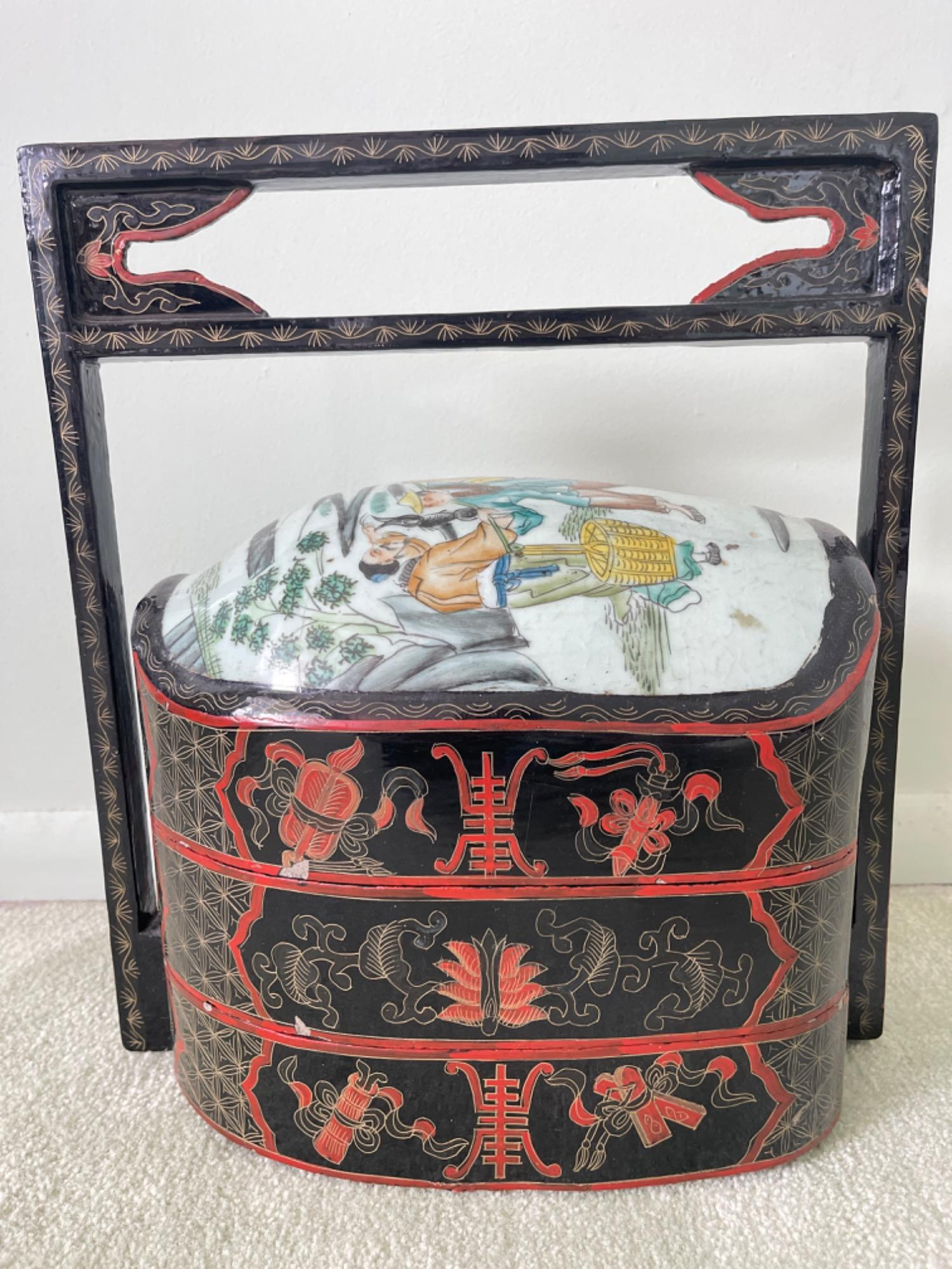 Lot # 50 - Vintage Chinese Lacquer and Porcelain Stacking Lunch Box