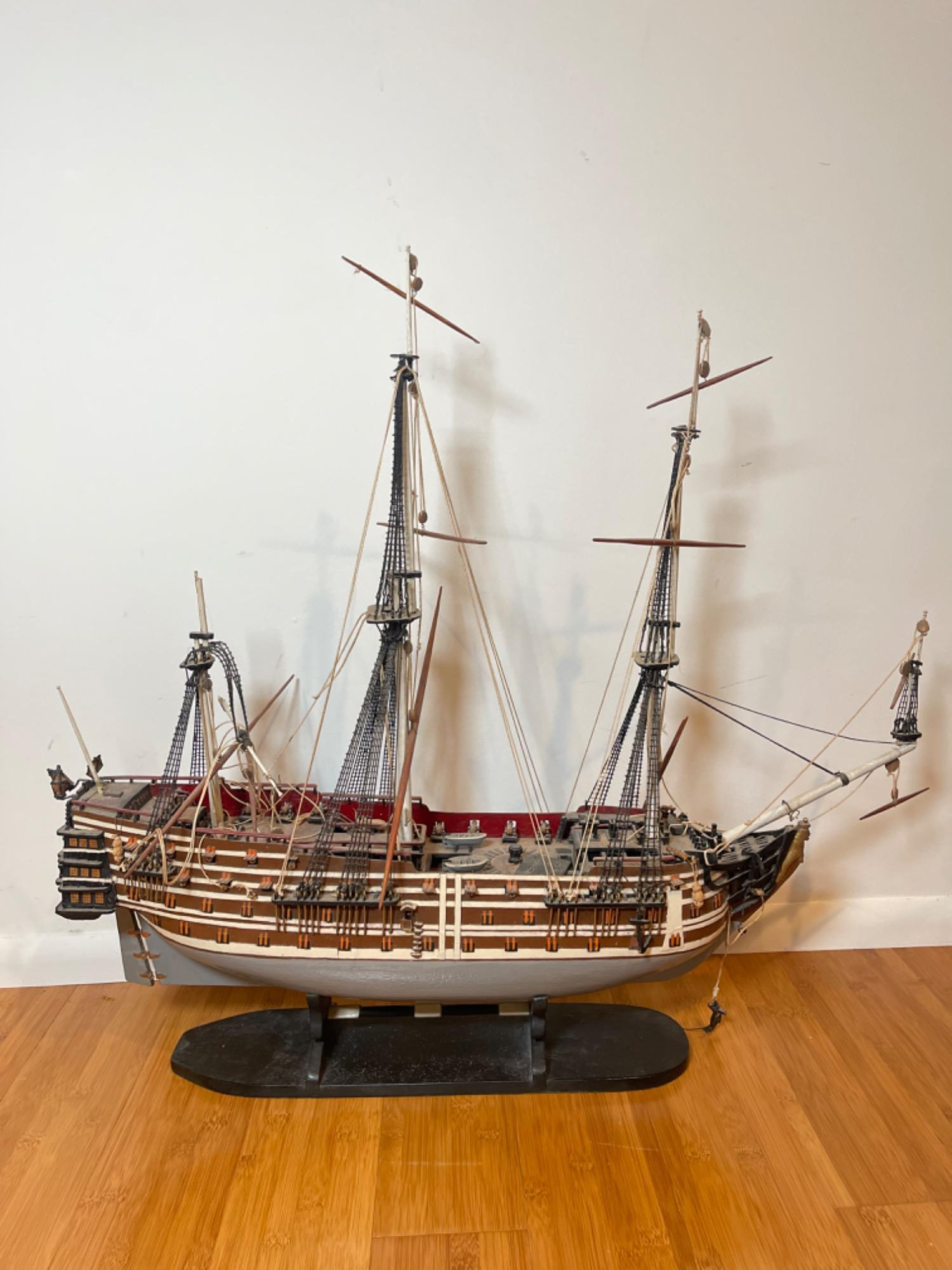 Needs cleaning and multiple repairs. No sails are included. Beautiful craftsmanship that needs some repairing and refurbishing. Measurements: 31 inches L x 6 inches W x 30 inches H