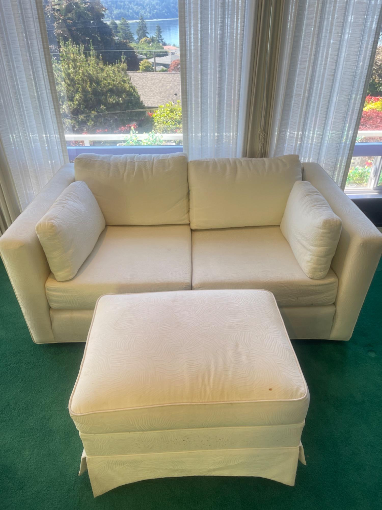 This loveseat and ottoman pair has more significant staining and snagging compared to the other one. It is still holding together well, but the stains have been photographed to the best of our ability. Love seat: 60 inches L x 35 inches D x 23 inches H Ottoman: 28 inches L x 22 inches W x 17 inches H