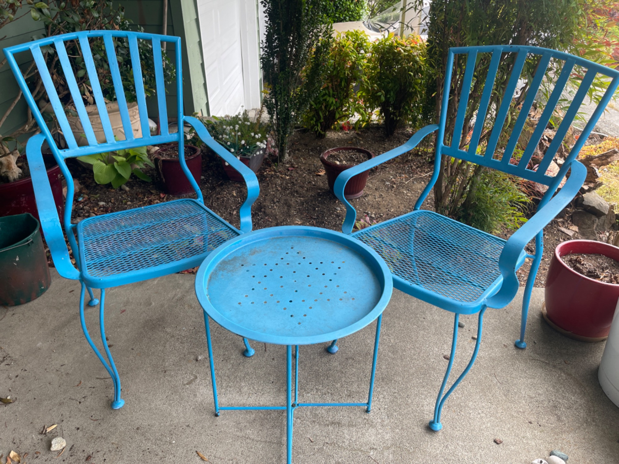 Sturdy, but need cleaning. All have some tarnishing and rubbing off of blue paint. Table: 18 inches W x 19.5 inches H Chairs: 21 inches L x 24 inches W x 36 inches H