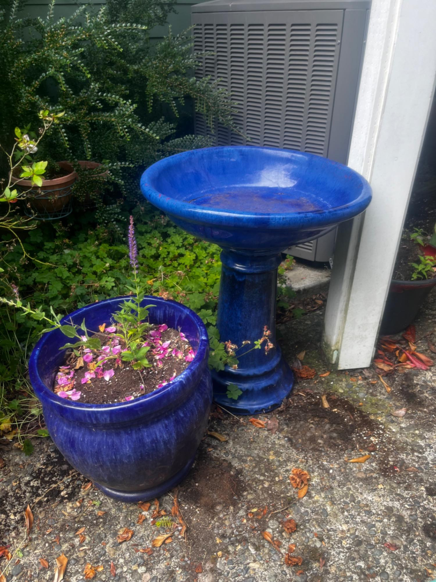 Bird Bath: 20.5 inches W x 25 inches H Pot: 14.5 inches W x 14.25 inches H Pot has a large crack on the inside, but it is still holding together well. Needs cleaning.