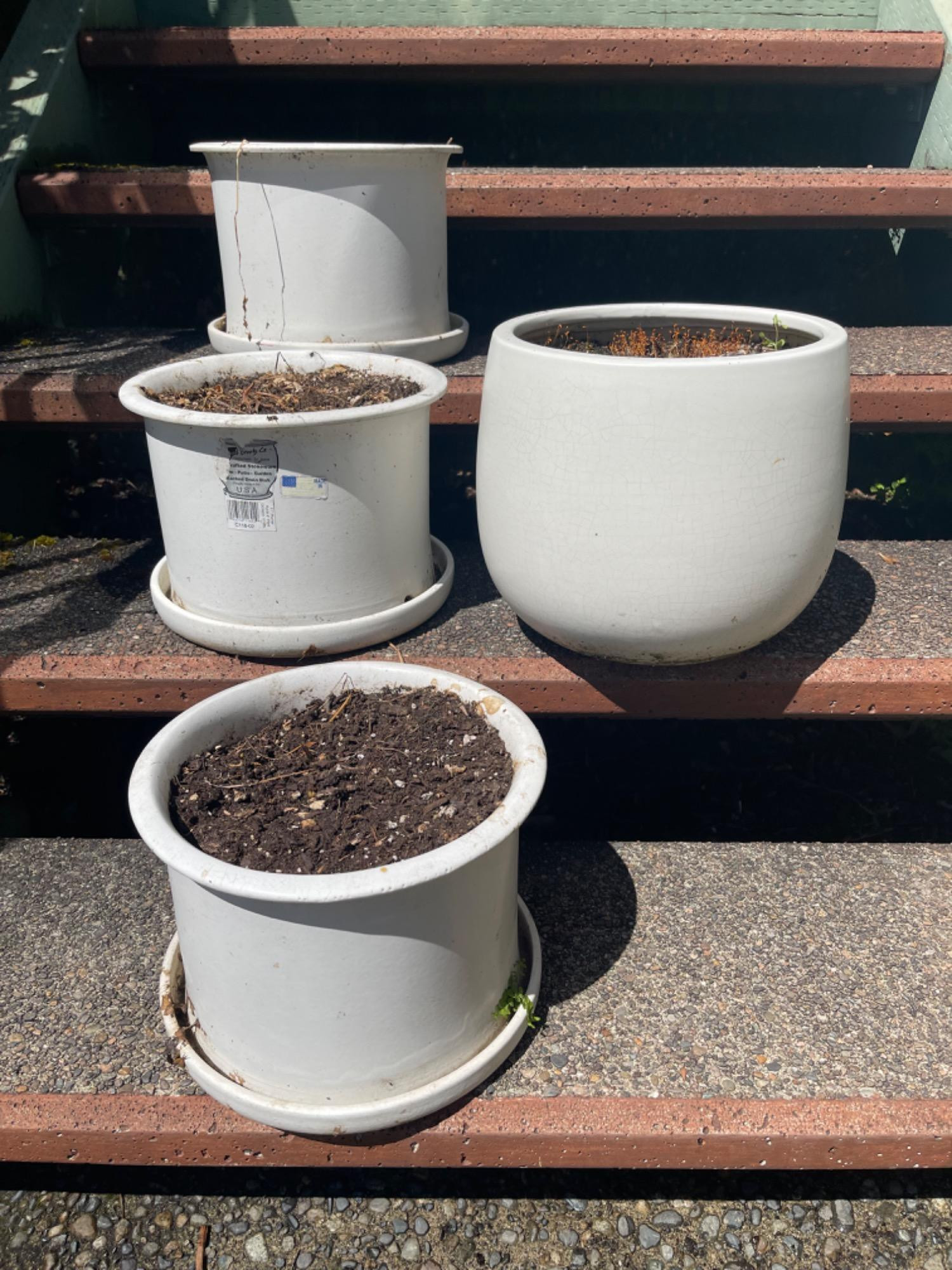 Four White Ceramic Pots Largest: 10T x 10.5W Small: 8T x 10.5W