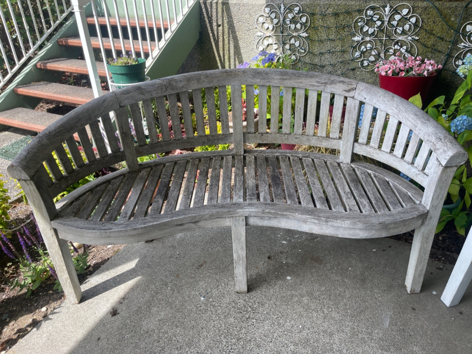 Has been kept out in the elements, and has significant wear due to rain and weather. However, it is sturdy and holding together well. Measurements: 60 inches L x 24 inches W x 34 inches H