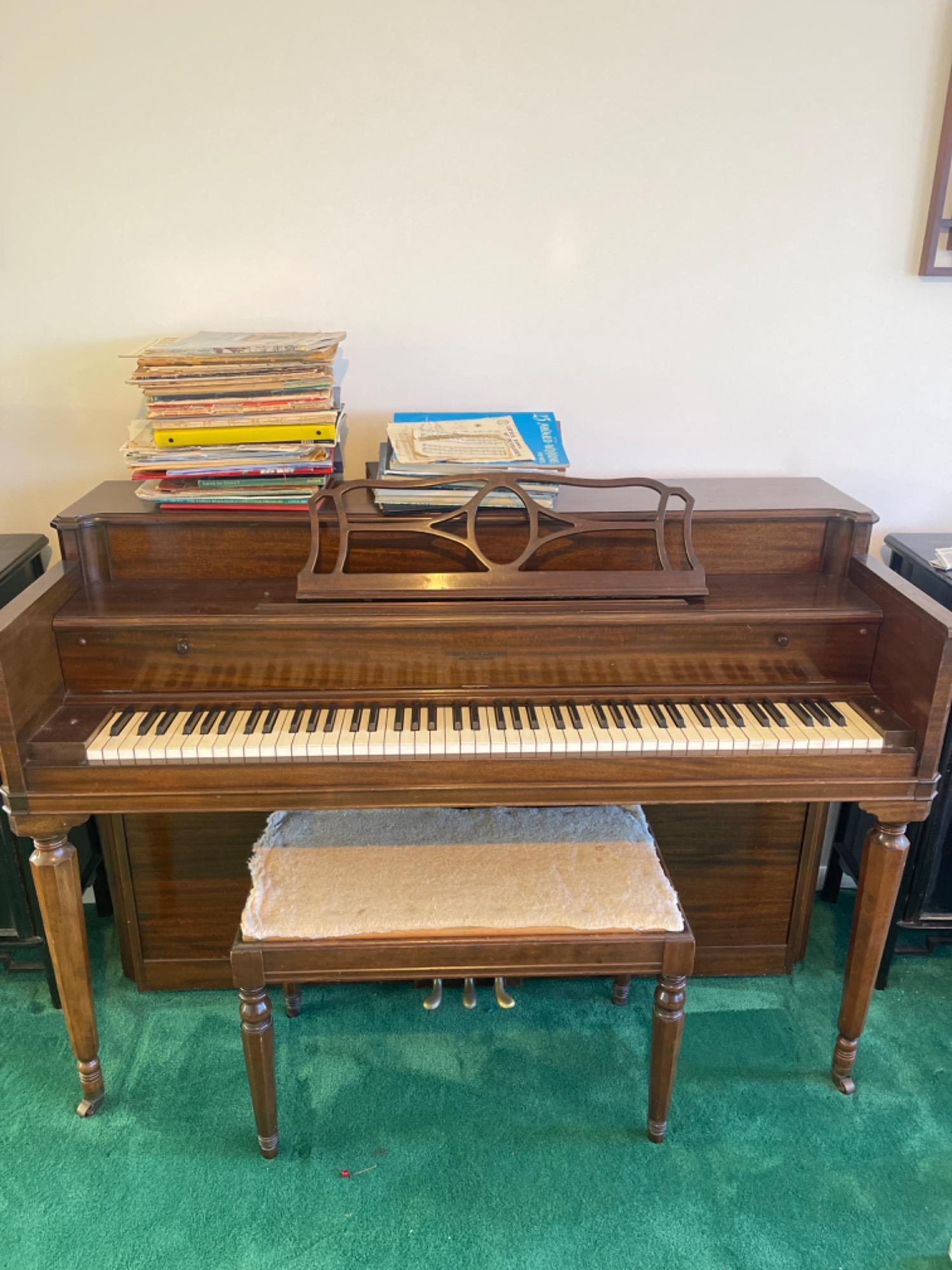 Inside has rusting and needs restoration. Wood has some scuffs and scratches but is in great condition. Music holder is broken off and also needs repair. Measurements: 57 inches L X 24 inches W X 40 inches H You MUST bring required amount of help to move and load this. We do NOT assist and retain the right to refuse those who come unprepared.