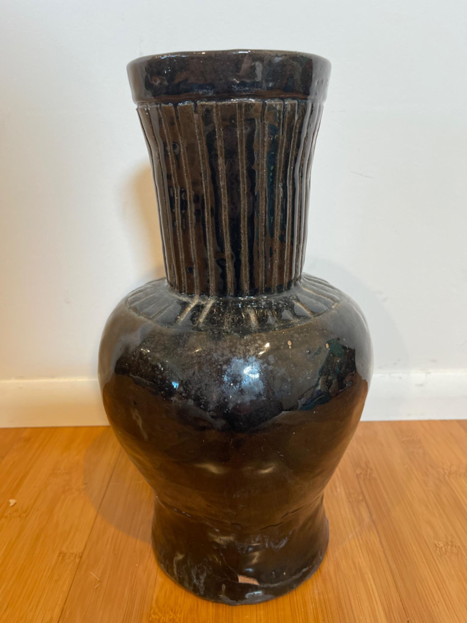Has one large crock and chip near the base, as well as a stain on the inside. 14 inches tall