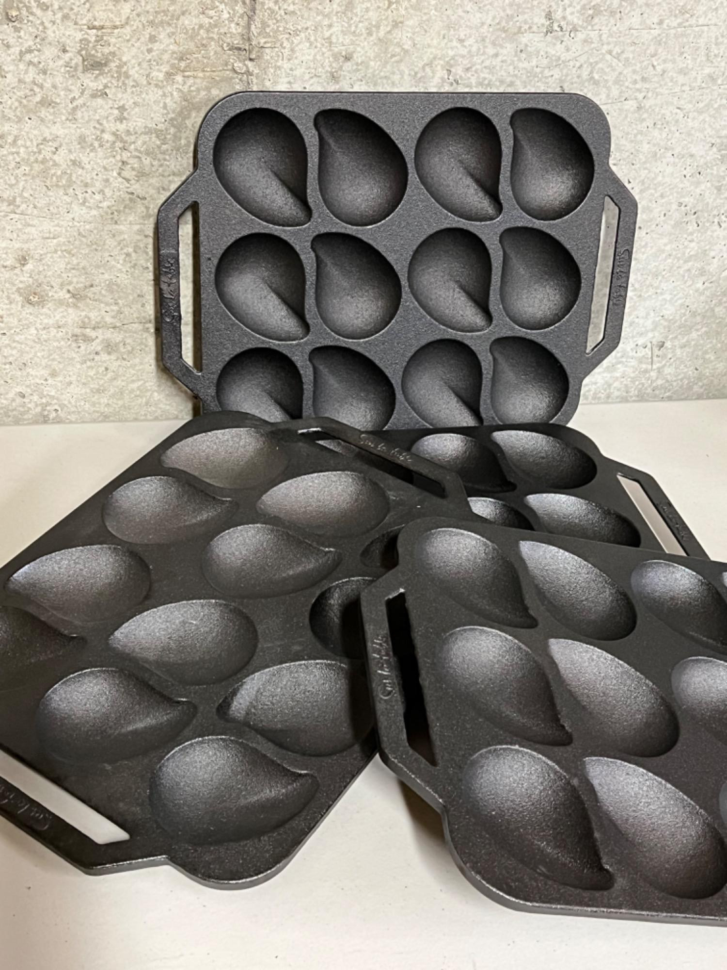 Four new cast iron oyster pans by Sur La Table. Heavy.