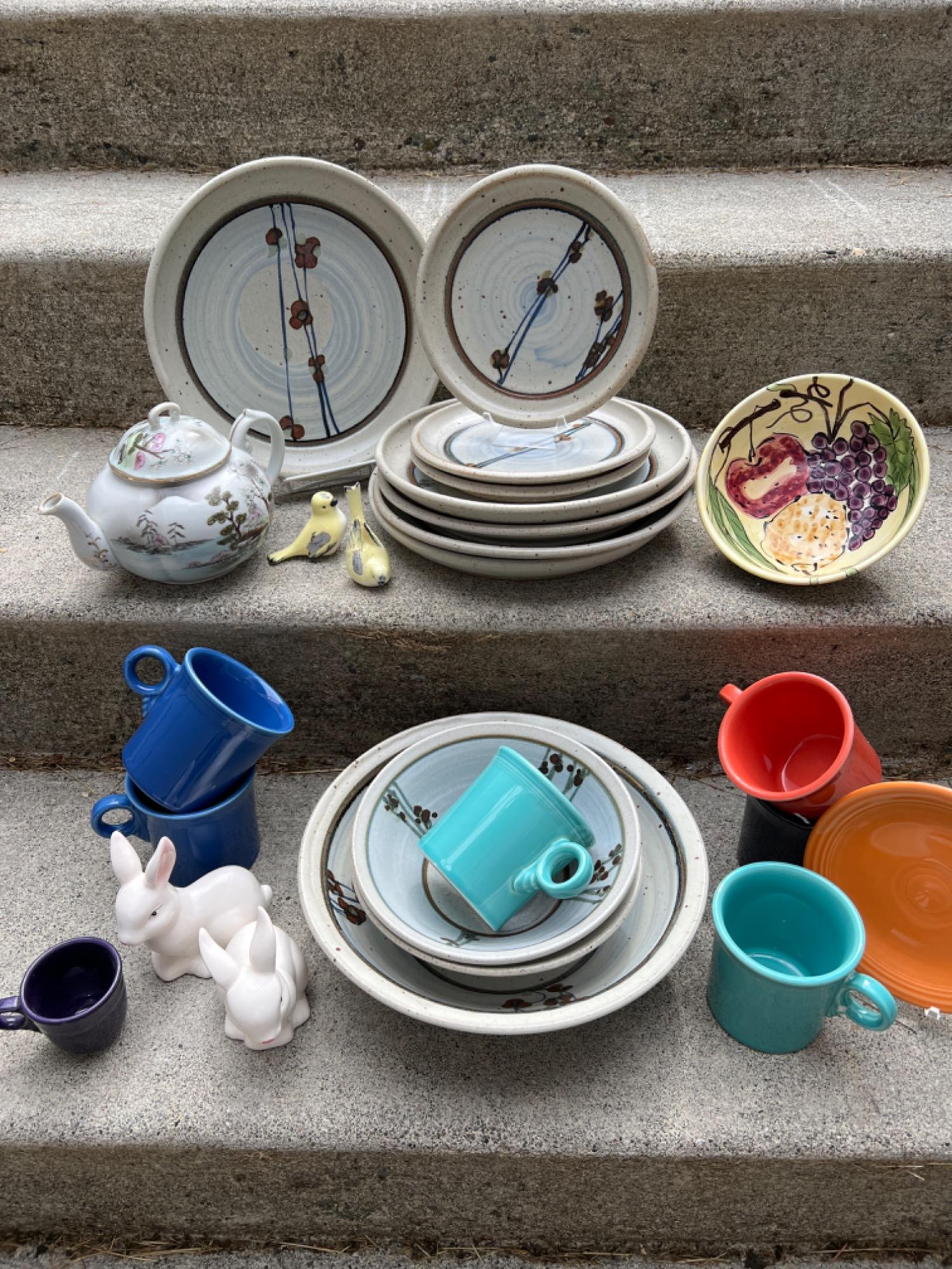 Stoneware Plates and Bowls (each piece has a varied art design) Vintage Nippon Japan Porcelain Teapot 6 Fiesta Mugs with one espresso cup and Fiesta Dessert Plate (various colors) Ceramic Bunnies and Tweet and Peep Birds