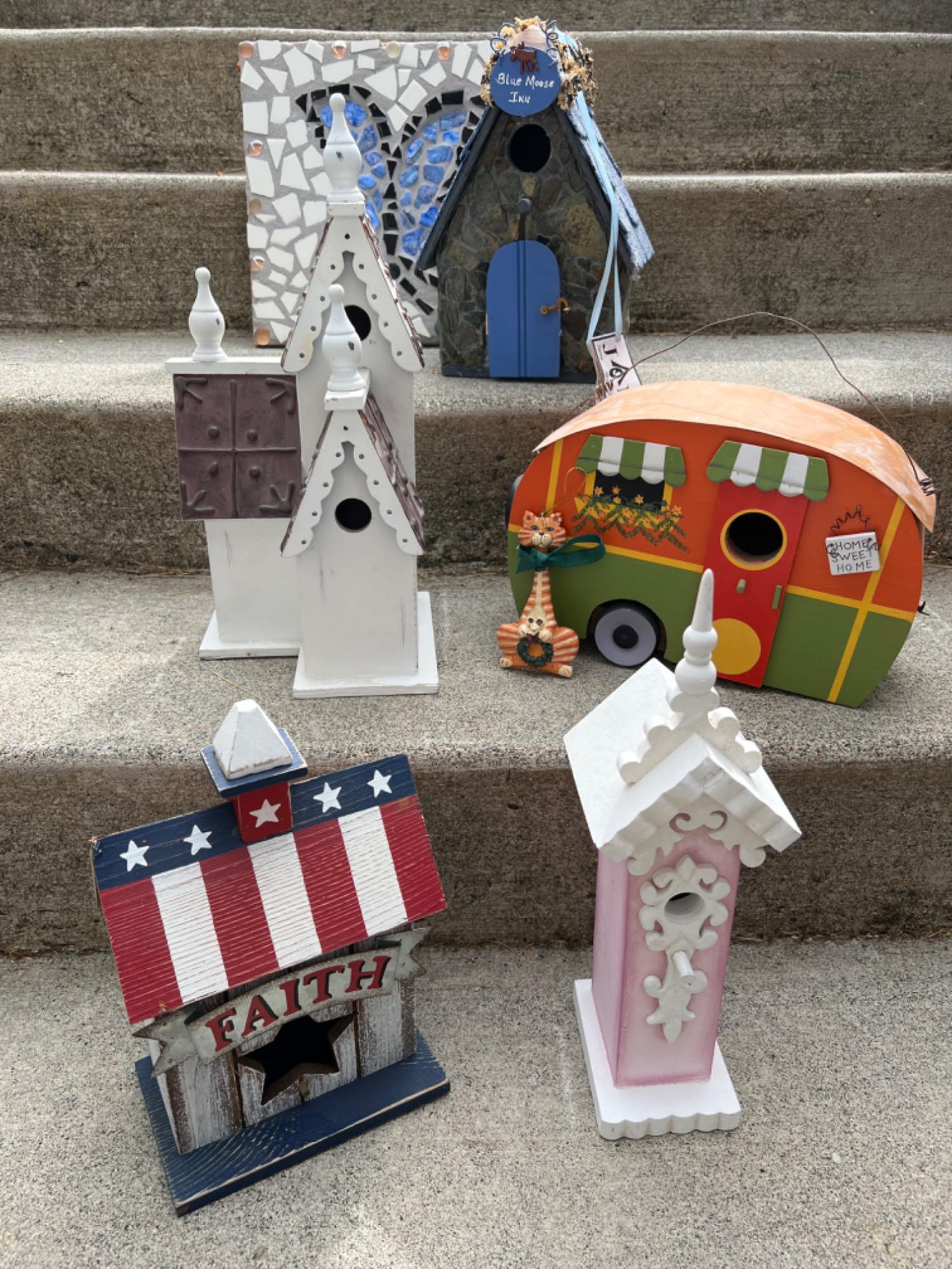 Outstanding decorative birdhouses ranging from 7" tall to 23" tall. Blue Moose Inn handcrafted by Joni of Anchorage, Alaska. Included is a decorative handcrafted butterfly tile for garden or pathway.