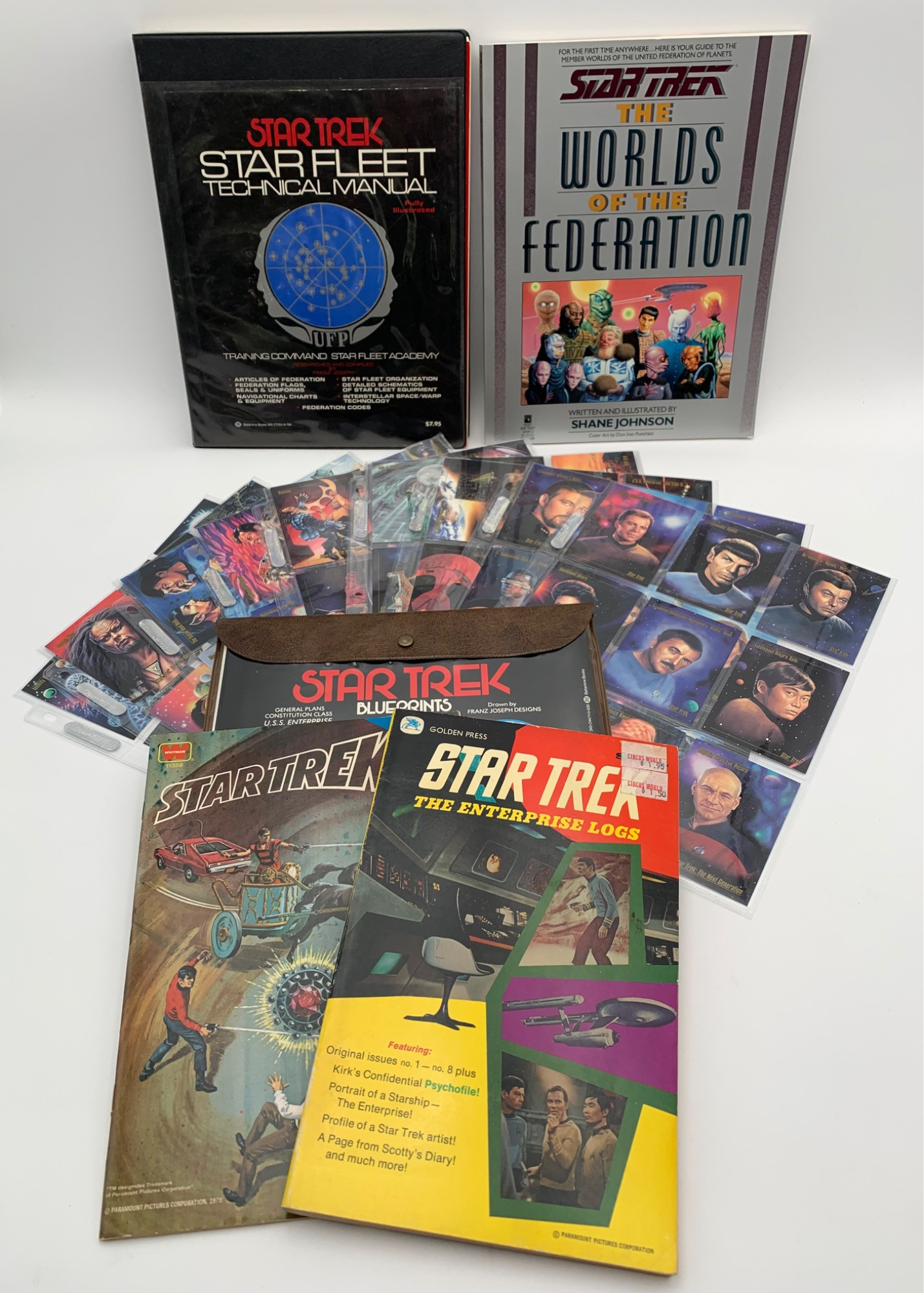 This lot is a lot! Take a look at: Star Trek Starfleet Technical Manual (Ballantine Books - 1975) with slide-in binder cover. Outlines everything you could want to know about Starfleet and its vehicles, protocols, etc. Measures approx. 11" H X 8.5" W. In good condition. Star Trek - The Enterprise Logs (Golden Press - 1976) comic book adventures. Measures 10.25" H x 6.75" W. Good condition. Complete set (90) of Skybox's Star Trek Collector cards. All of your favorite characters, aliens, and situations from the series by many renowned artists. Front has portrait/scene while back tells about the subject and the artists who created the image. Each is numbered & #90 is a checklist of all cards. Measure 3.5" H x 2.5" W. They appear to be in pristine condition kept in protectors. Star Trek Blue Prints (Franz Joseph Designs). 12 detailed blueprints of the USS Enterprise. Each print measures 9" H x 30" W. Comes in vinyl snap pouch. In great condition. Star Trek - A Bomb in Time & The Psychocrystals (Whitman Publishing - 1978 #11358) Comic book adventures. Good condition. Measure approx. 10.25" H x 7" W. Star Trek - The Worlds of the Federation (Pocket Books - 1989) with illustrations of different races, beings, and most everything you can think of in The Federation. Note that the spine on this book is "broken" so the folios in the middle are loose with one completely separated - see last photo. Measures approx. 11" H x 8.5" W