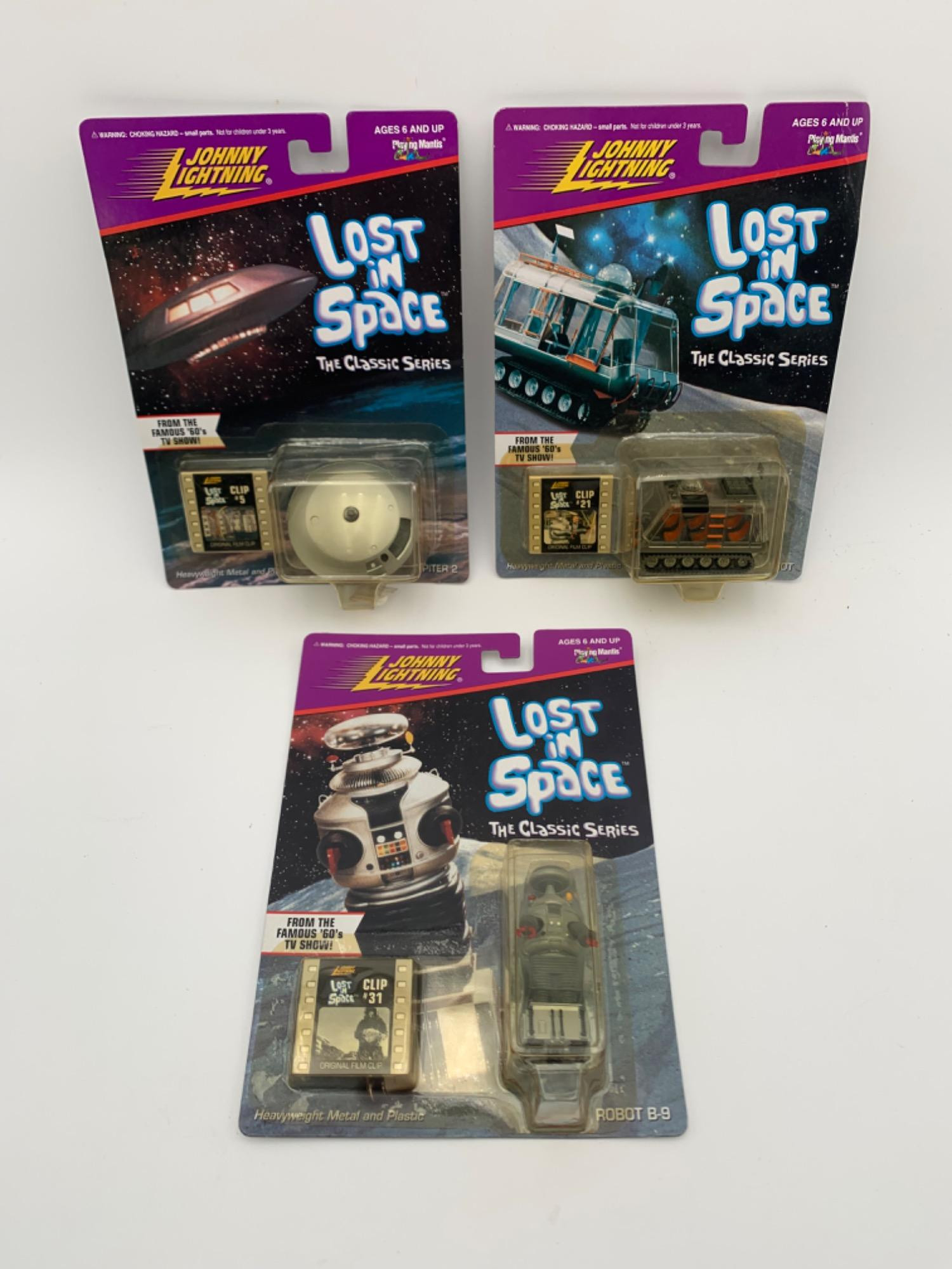 3 New in Box Lost in Space figures from Johnny Lightning by Praying Mantis Toys - item #433-00 for all three: Chariot, Robot B-9, and Jupiter 2. 1998 manufacture with toy and film clip in each. Plastic packaging has yellowed with age, but is still intact and cardboard backers are in great condition with only slight bowing & one crease on the Chariot figure. Size varies - Chariot is 1.75" H while Robot B-9 is 2.75" H.