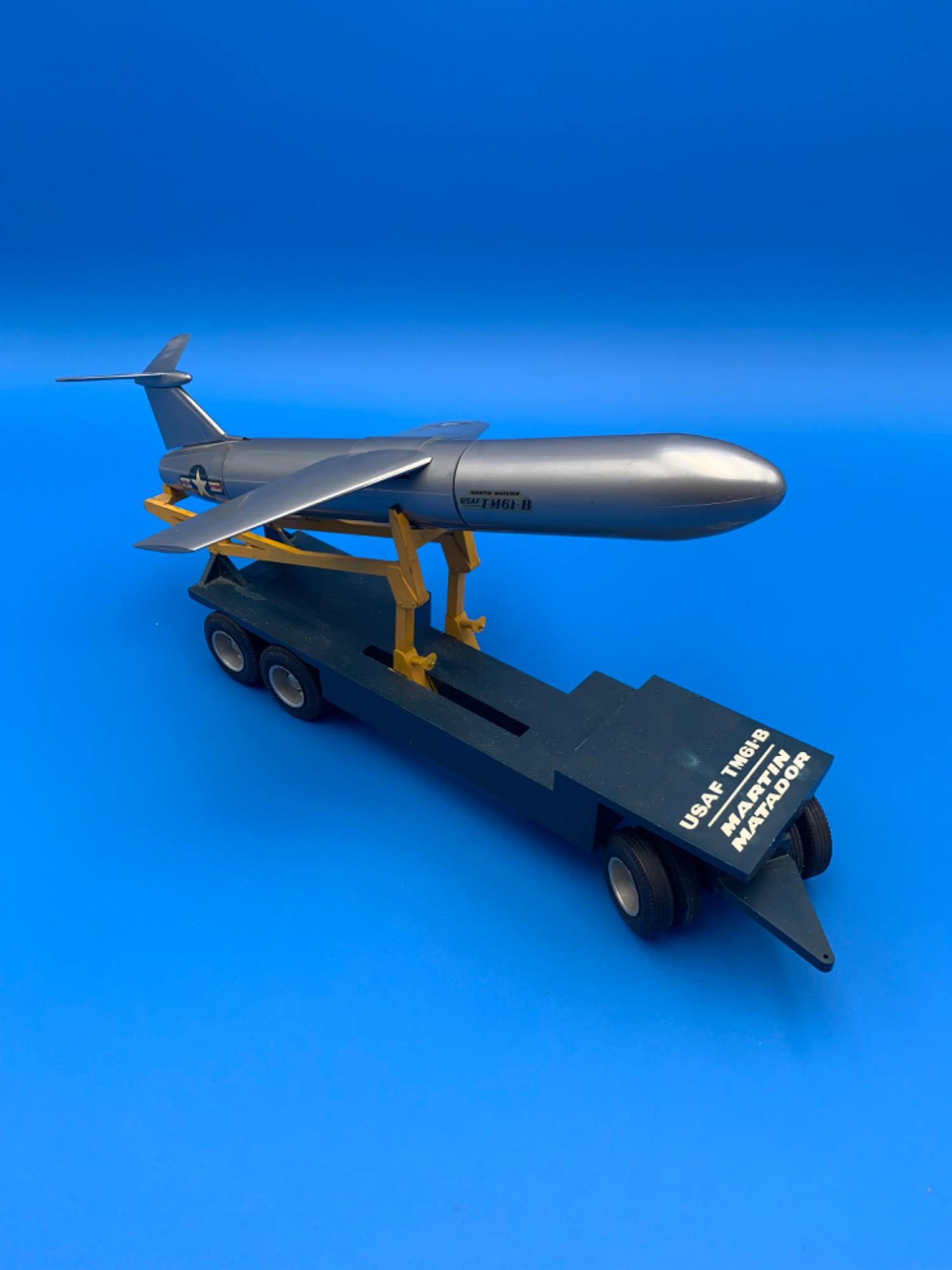 Desktop model of a Martin Matador TM61-B with US Air Force decals. Vintage model from Topping includes the aircraft and its trolley carrier. Grey model has red, white, & blue coloring plus black lettering. Trolley is a dark green plastic bed, painted yellow carrier structure, and metal wheels with black rubber tires. In good condition; please note that it could use a good scrub after being in storage and look closely at the photos as there are a couple of places on the decals/trolley where paint is missing. However, these flaws are very slight and the piece still displays very well. Measures 6" H x 14" L. Shy 6" wingspan.