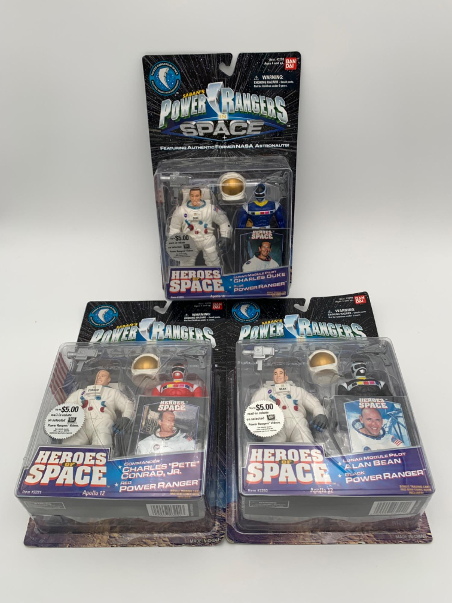 Complete set of 3 Power Ranger space figures - Charles Duke, Pete Conrad, & Alan Bean. All measure approx. 5" H and each astronaut is accompanied by a blue, black, or red Power Ranger figure along with lots of accessories. From the "Heroes of Space" line - model #19980 from Ban Dai of China. All are in plastic packaging on cardboard backs. Duke and Conrad are NIB, but Bean's packaging has pulled away from the backing. All contents of Bean's plastic packaging are still intact and not disturbed. Cardboard backs are in good shape with the exception of some crumpling on select corners - see photos for details. Note: these 3 figures are also available in Lot #83 without the Power Ranger figures.