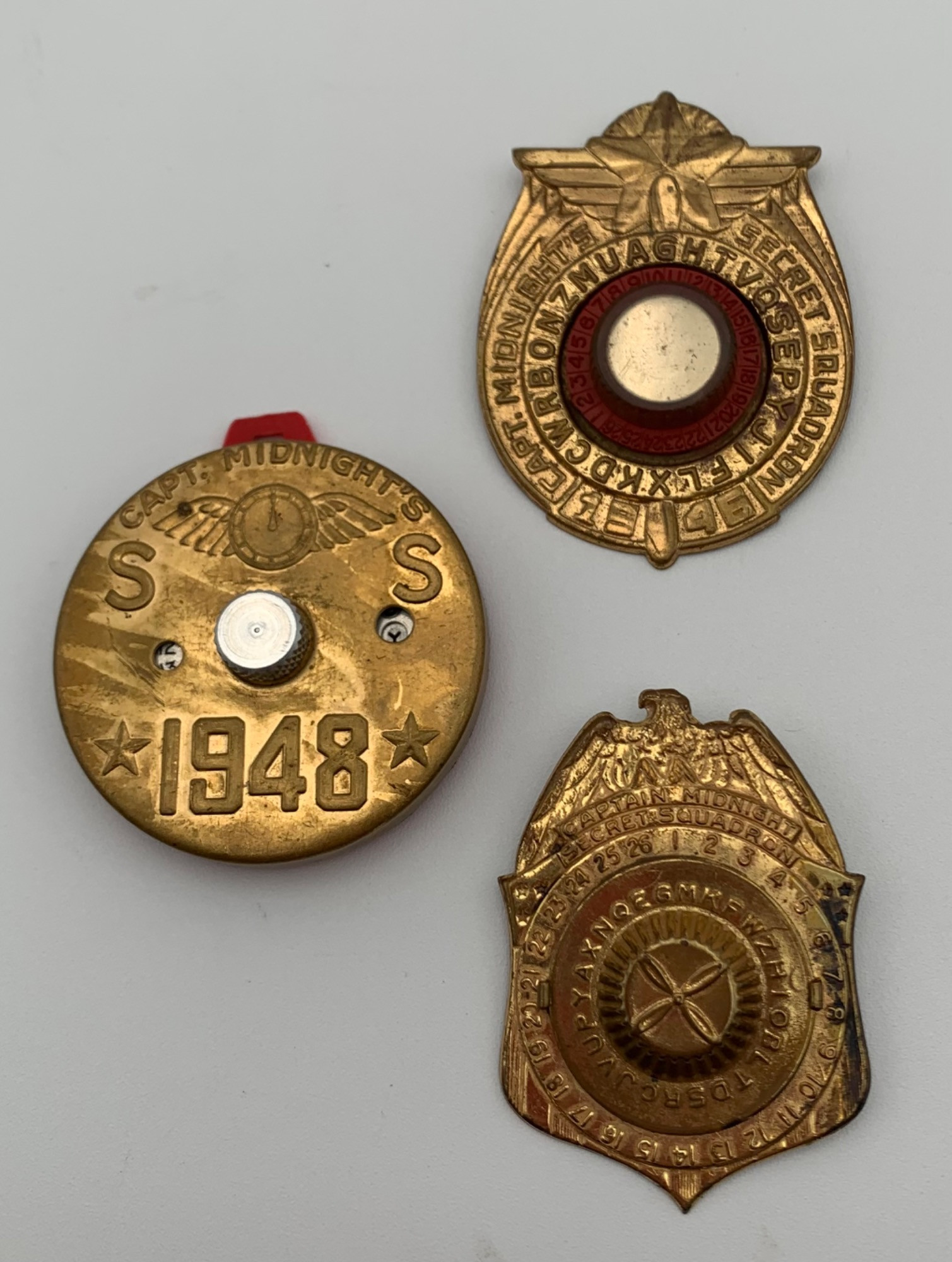 Group of Captain Midnight Decoder badges from the 1940s. The Captain’s radio show was sponsored by Ovaltine and he