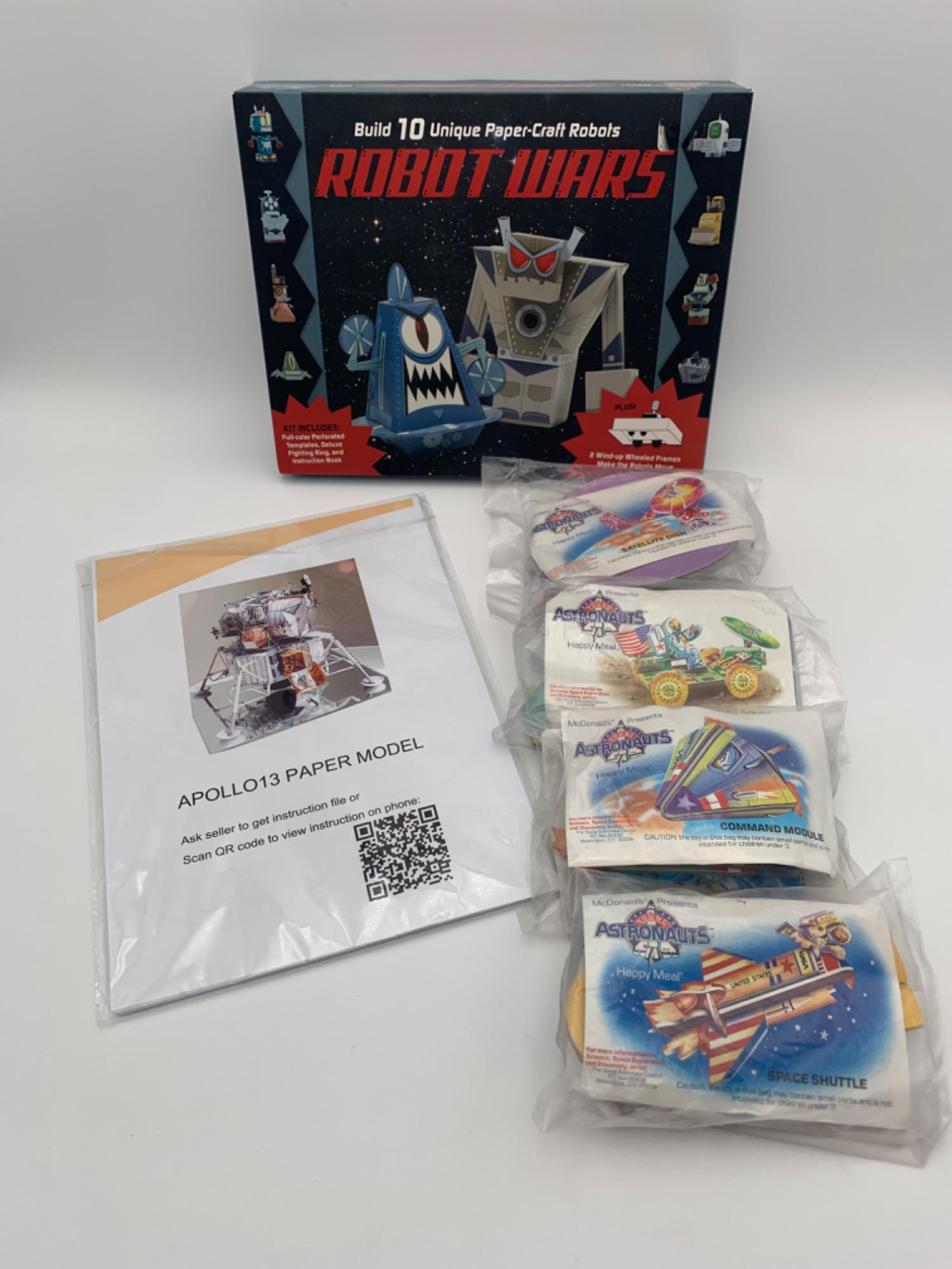 Three sets of paper models ready for you to build - from spectacularly easy to amazingly intricate - something for every skill level! Easiest: McDonalds Happy Meal "Astronauts" complete set (4) of cardboard fit-together models of the Lunar Rover, Space Shittle, Satellite Dish, & Command Module. Medium Difficulty: 10 Robot Wars paper robots from Sterling Innovation. Heavyweight paper sheets are perforated for easy removal & moving bases included to set the robots on when completed. Hardest: Apollo 13 Lunar Lander model by a Japanese designer - 1:48 scale....Yowza, this is 21 pages of pure concentration! Printed on photographic quality heavy paper, all pages are for a SINGLE model of exquisite detail! Quick read code takes you to highly detailed pictures of the piece being put together. Not for the faint of heart.