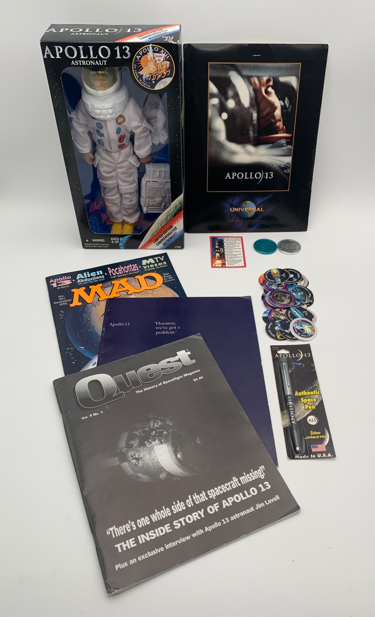 Ron Howard directed the Apollo 13 movie from 1995. It starred Tom Hanks, Kevin Bacon, Bill Paxton, Gary Sinese, Kathleen Quinlan, & Ed Harris. This lot includes memorabilia from the movie. Apollo 13 astronaut action figure - with space suit and additional equipment from Kenner - model #27508. Stands approx. 12" H in spacesuit with the mission logo. Appears to be NIB - the tape looks intact as does the waist and foot twist-ties. Please see last 2 photos to check for yourself. Fisher Apollo 13 pen - writes upside down, underwater, and at extreme temps. Fisher made the actual pens the astronauts took on their spaceflights. New in package. Lots of POG collector coins from the movie - includes blue & silver "medals". Measure approx. 1.5" W. 2 publications with VERY different viewpoints covering the Apollo 13 movie: Mad Magazine & Quest - The History of Spaceflight Magazine. Apollo 13 movie press packet - includes 8 black & white promo stills from the movie, a production booklet, and a case & crew booklet all in a folder. APOLLO 13 - HOUSTON, WE'VE GOT A PROBLEM Booklet. NASA publication EP-76 from 1970. 25 pages. Good used condition.