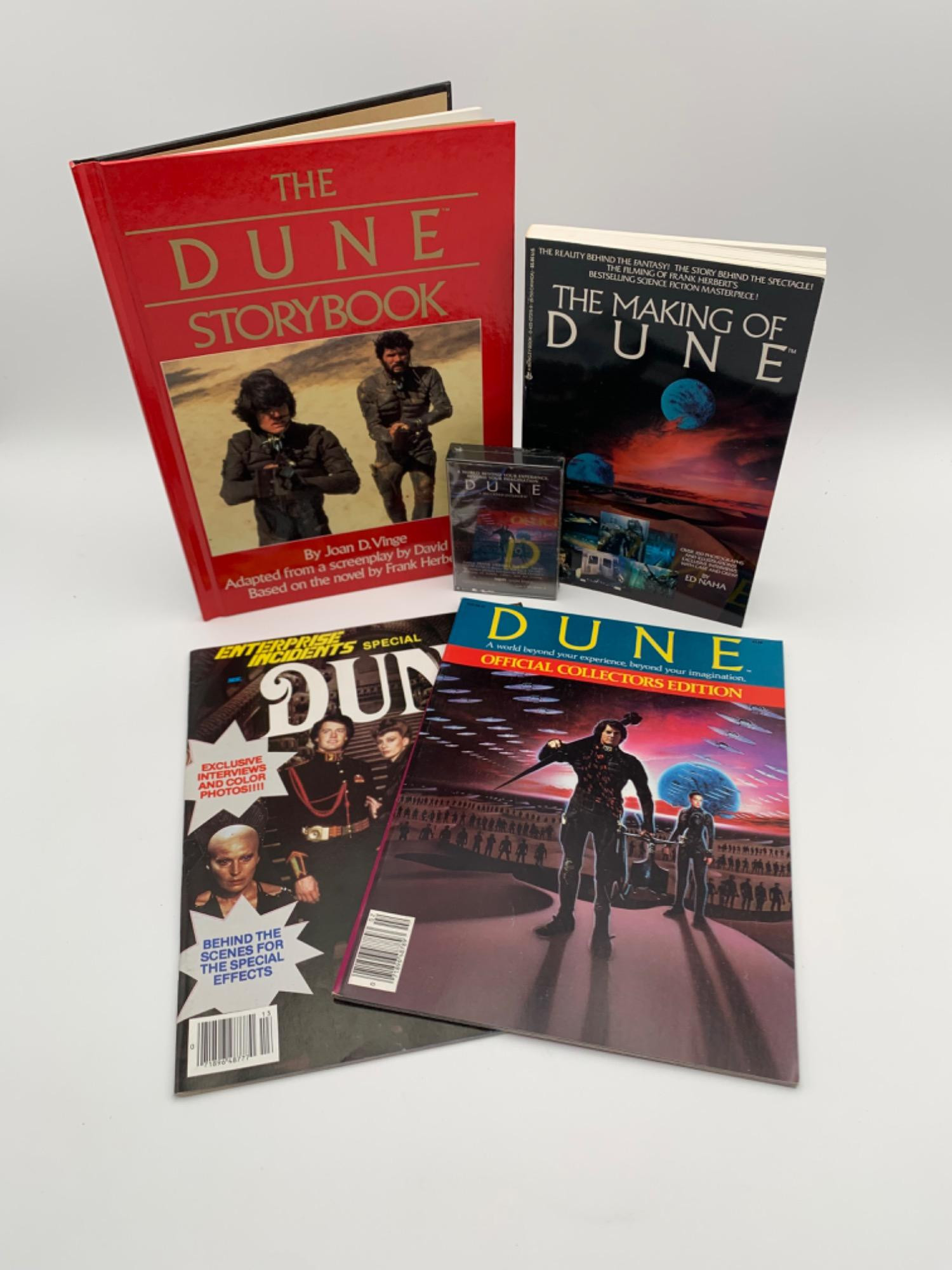 For all of those "old school" fans of the 1984 movie version of Dune - we remember it being VERY long in the same way the book was VERY long, but it still has regions of devoted fans out there and if you are one, you are in luck! For the young set, this is NOT the Zendaya & Chalamet one, this is the one starring Kyle Maclachlan, Patrick Stewart, & Sting. Enterprise Incidents Special "DUNE' Fanzine. Lots of behind the scenes info, special effects info, and interviews with the cast. 1984. DUNE - Official Collector's Edition Booklet from Paradise Press and Dino DeLaurentis. Lots and lots of on-set photos and explanations about characters' backstories. 1984. THE MAKING OF DUNE by Ed Naha. Softcover. 1984, Berkeley Books (New York, NY). 299 pages - appears to be unread. THE DUNE STORYBOOK by Joan D. Vinge. Hardcover. 1984, Putnam & Sons (New York). No pagination. In excellent condition - read maybe a couple of times. DUNE- A RECORDED INTERVIEW by Walden Tapes of Connecticut. Frank Herbert (author of the Dune books) and David Lynch (director of the movie) discuss the making of the movie. New in original unopened shrinkwrap.