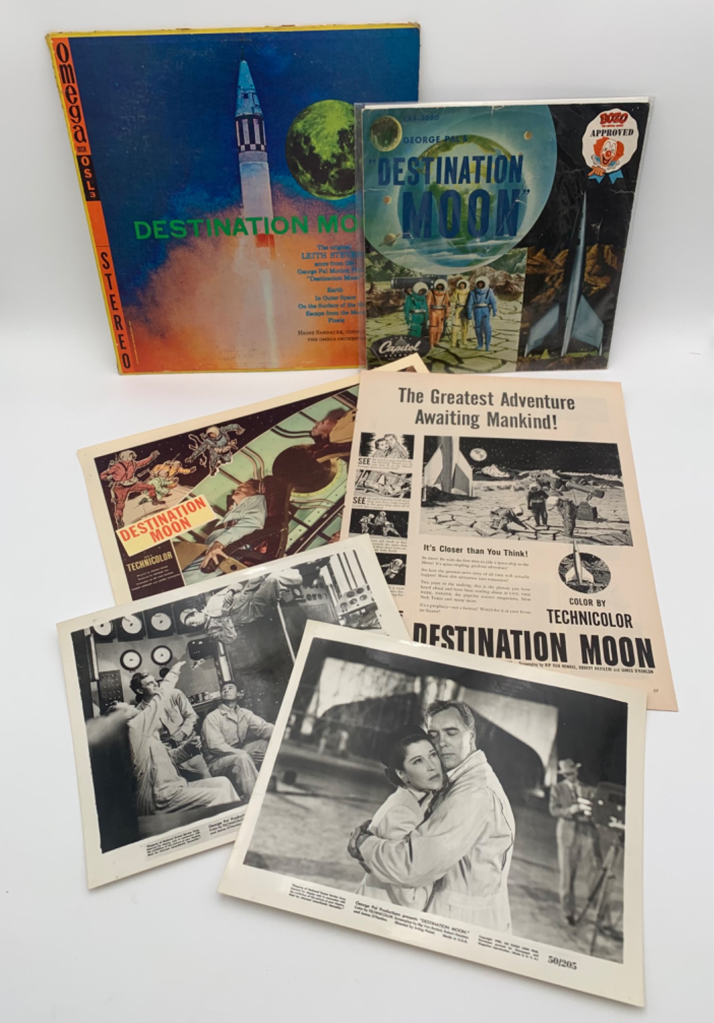 This lot is a mix of promo items & memorabilia from the movie "Destination Moon" (1950) starring John Archer. Interesting tidbit - the screenplay was written by a trio that included famous sci-fi author Robert Heinlein. Lot includes: Destination Moon Soundtrack LP from the Omega Orchestra. We didn't test the record, but it appears to have no egregious scratches. The cover definitely shows wear and is starting to split at the top. Destination Moon LP for kids from Capitol Records - it's supposedly unbreakable and Bozo-approved! Very thick like old 78 records. Smaller than the traditional 33 rpm record - measures 10" square. There are a few scratches visible as one would expect from a kids' record. 2 black & white