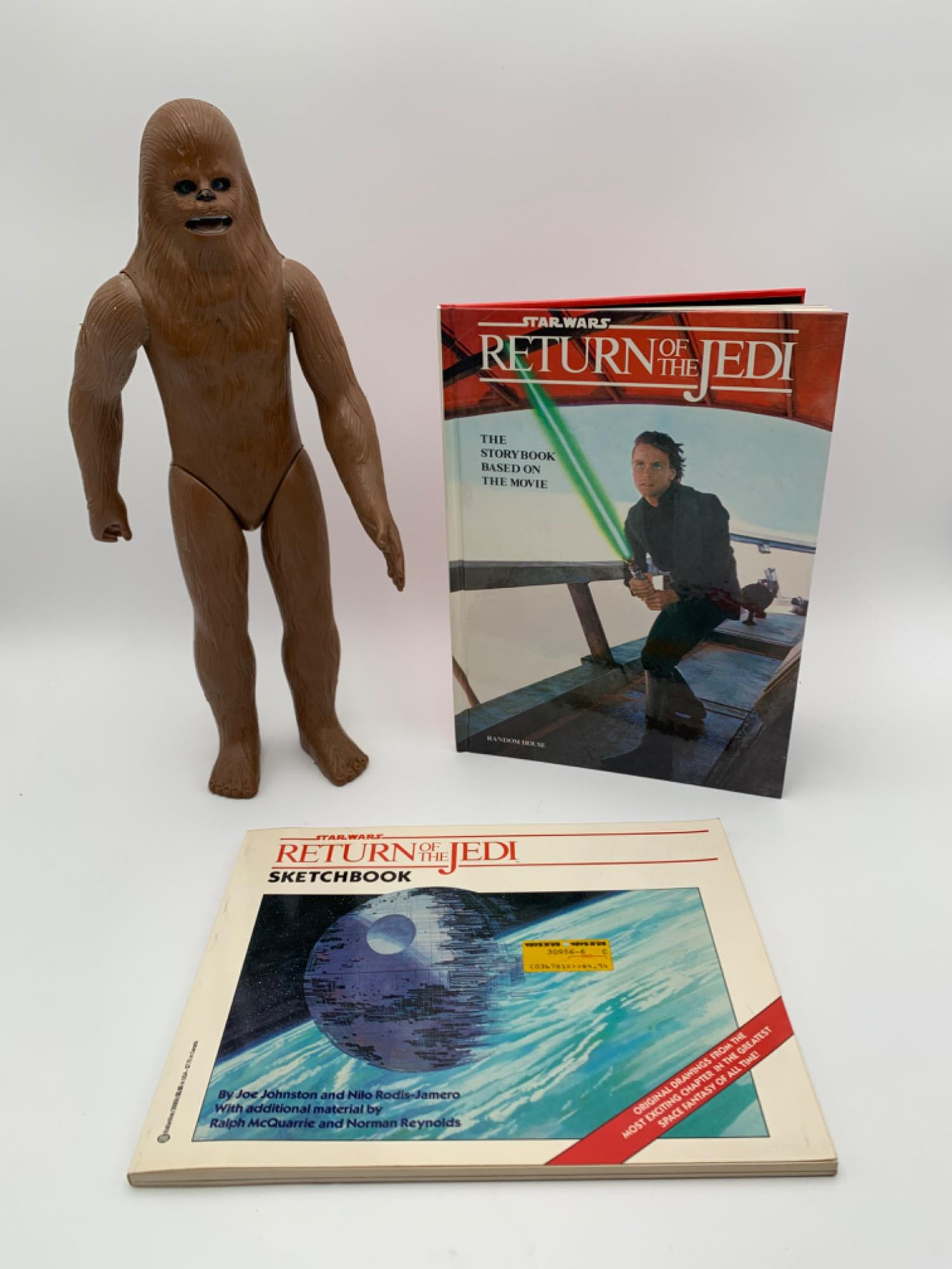 15" Chewbacca action figure in brown hard plastic from G.M.F.G.I. of Hong Kong - 1978. Stands on his own, has moveable legs & arms. He is in pretty good shape despite obviously being loved - some scratches/rubs on brown plastic "fur", but we think a lot of it is soil that could be eliminated with a good scrub. Please see photos to judge for yourself. Also included are 2 books: STAR WARS RETURN OF THE JEDI SKETCHBOOK by Joe Johnston & Nilo Rodis- Jamero. Softcover. 1983, Ballantine Books (New York NY) 96 pages. Black & white sketches used to create the characters & sets in the film. In good shape. STAR WARS RETURN OF THE JEDI - THE STORYBOOK BASED ON THE MOVIE adapted by Joan D Vinge. Hardcover. 1983, Random House (New York NY) No pagination. In great shape - looks virtually unused