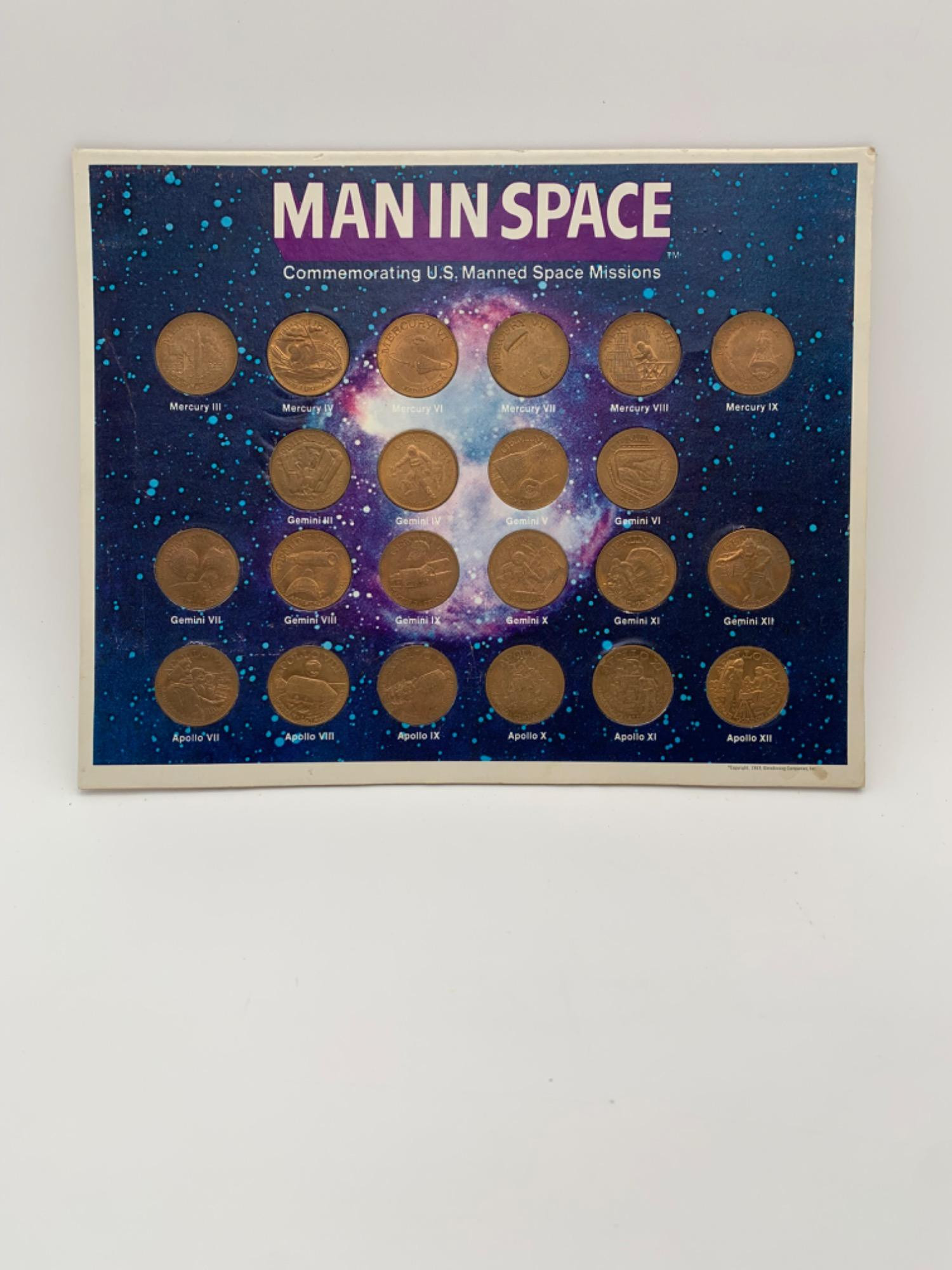 22 commemorative coins of the US Manned Space Missions from Glendinning Corp. 1969. Double-sided coins; front has logo/picture with mission name & astronauts while verso has the calendar date of the mission and its primary purpose. Ranges from Mercury III to Apollo 12. The coins are just slightly larger across than a quarter. In cardboard holder.
