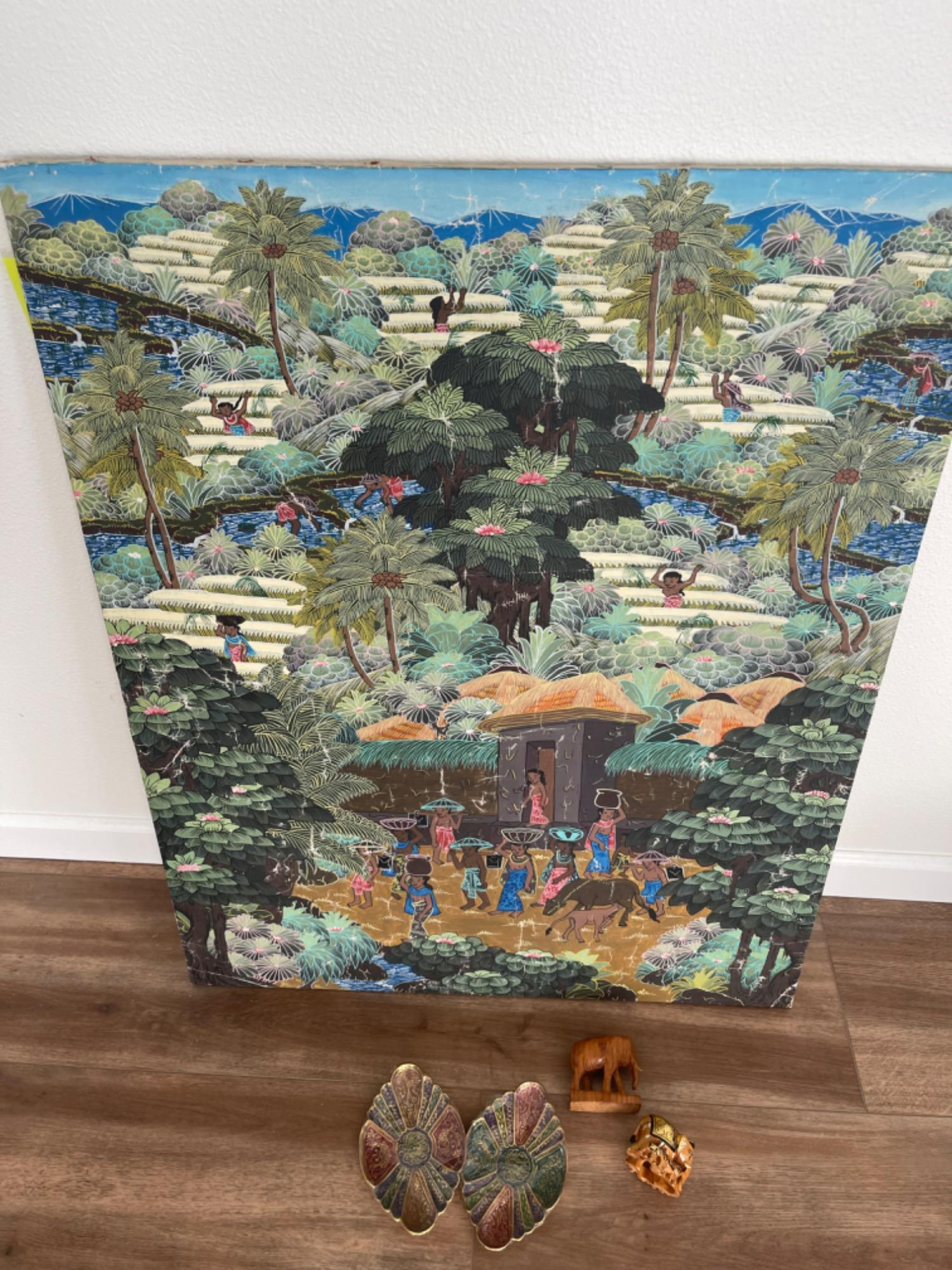 Bali Painting Of Indonesian Jungle, Persian Print and Other Collectibles. Bali Painting Of Indosien Jungle 33 T x 27 W Two wood miniature elephants, Metal miniature serving trays.