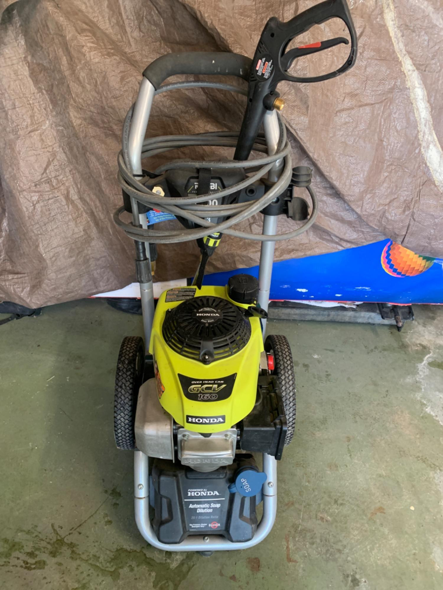 Ryobi gas powered pressure washer. Honda GVC 160 motor. 2.3gpm and 2800 PSI. Powers up. Hose, rod and 4 inserts.