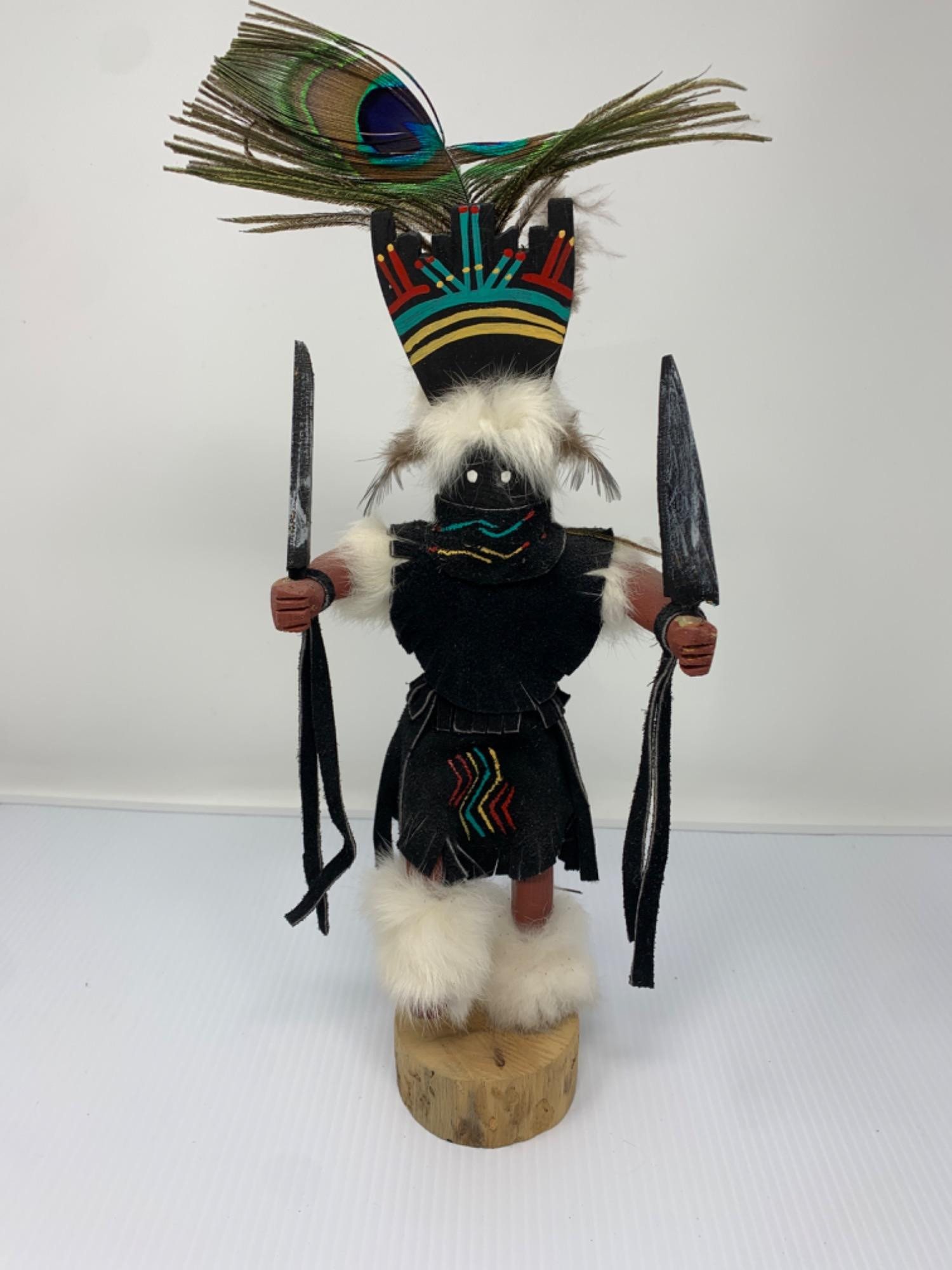 Signed Apache Katsina figure. Rabbit fur, peacock, feathers and leather materials. Wood figure hand carved and painted.