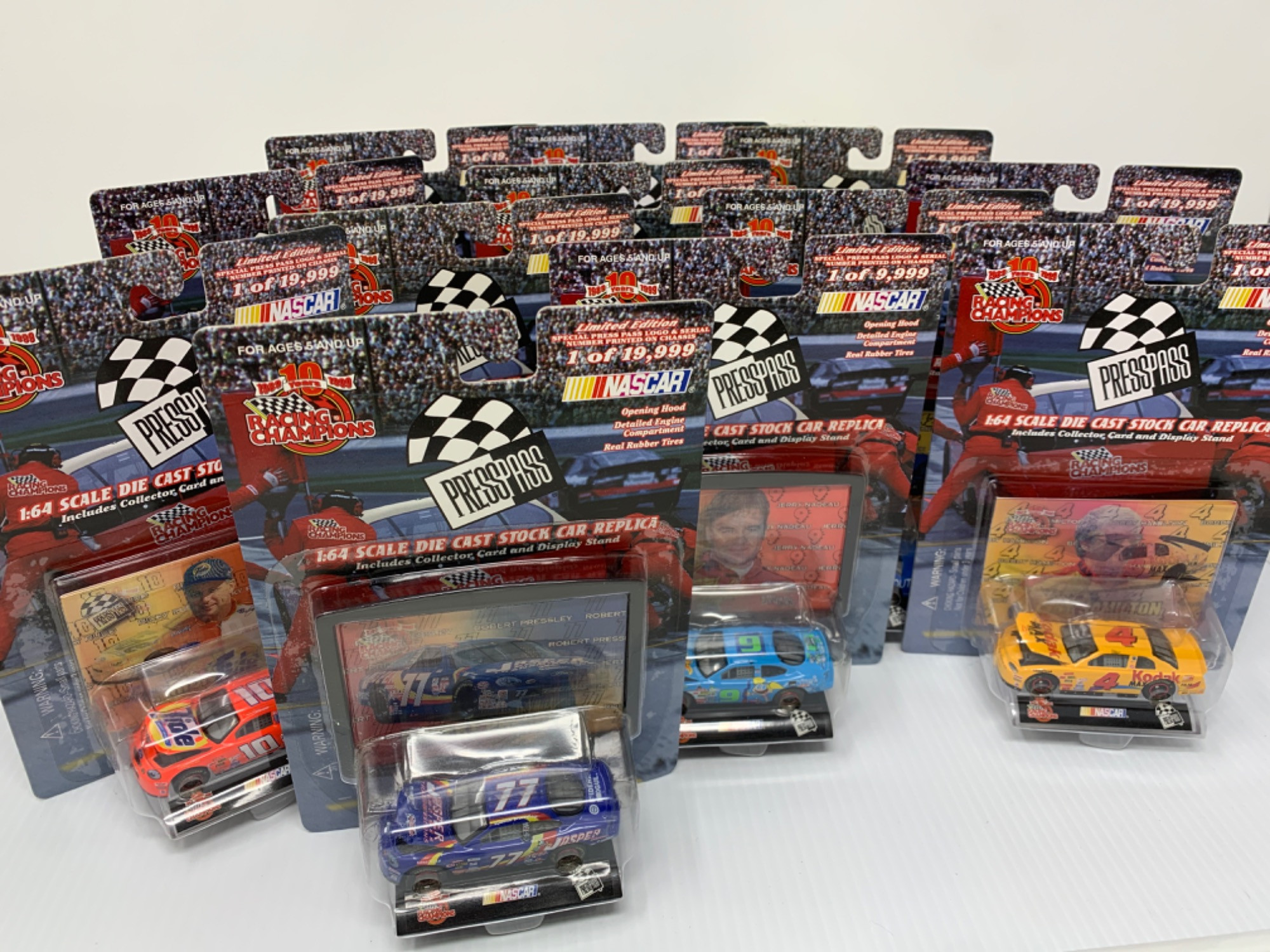 New inbox. Racing champions, NASCAR diecast car collection. Scale 1/64. Includes collector card and display stand. Most cards are holographic press pass series. Large variety.