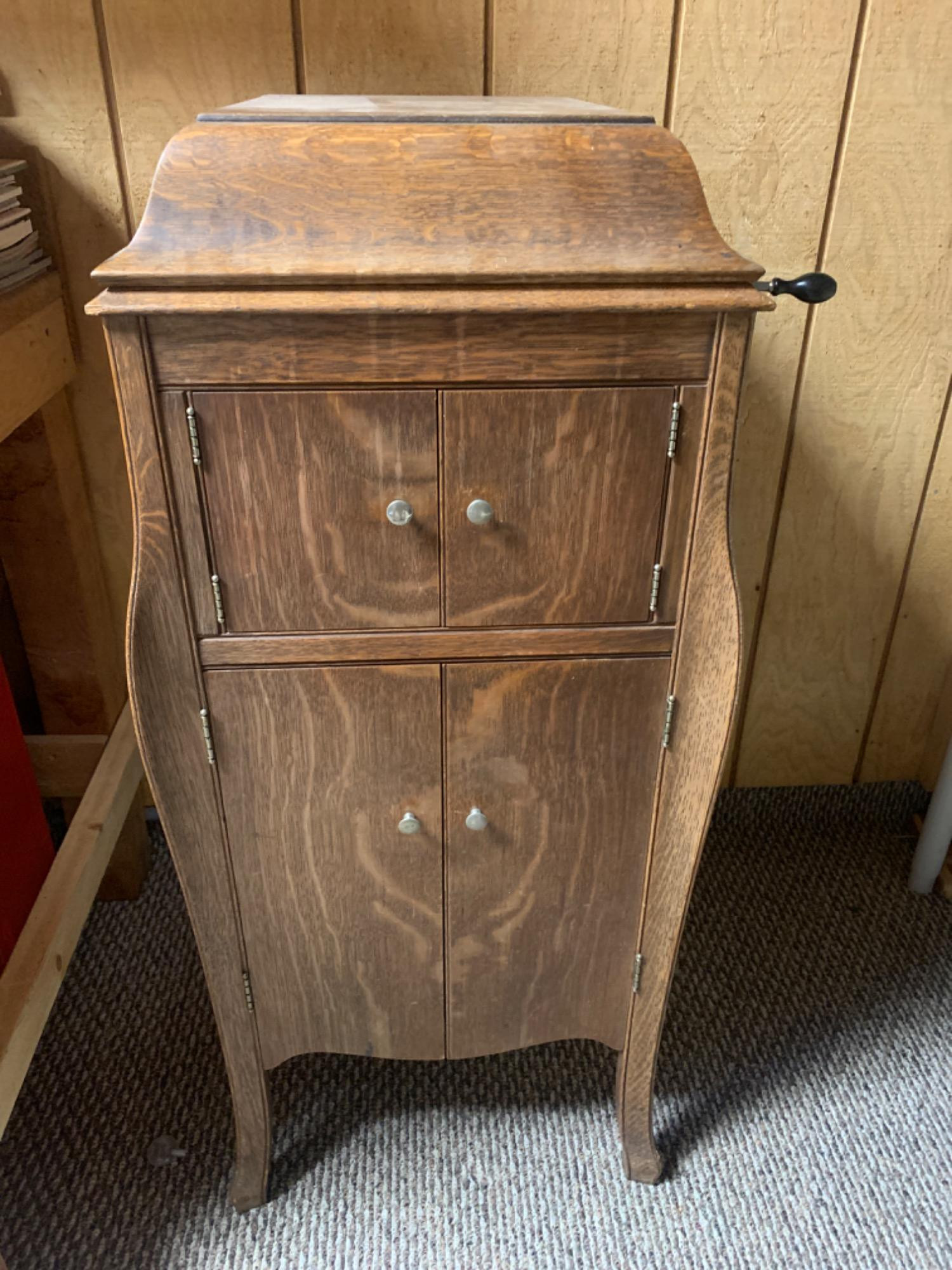 1917 Victor Victrola Phonograph Talking Machine. Does work. Extra needles and parts. Several albums included. Frank Sinatra, Bing Crosby and more. Electronic modification done. Component is removable. Did not see how to power that up. Easy load location.