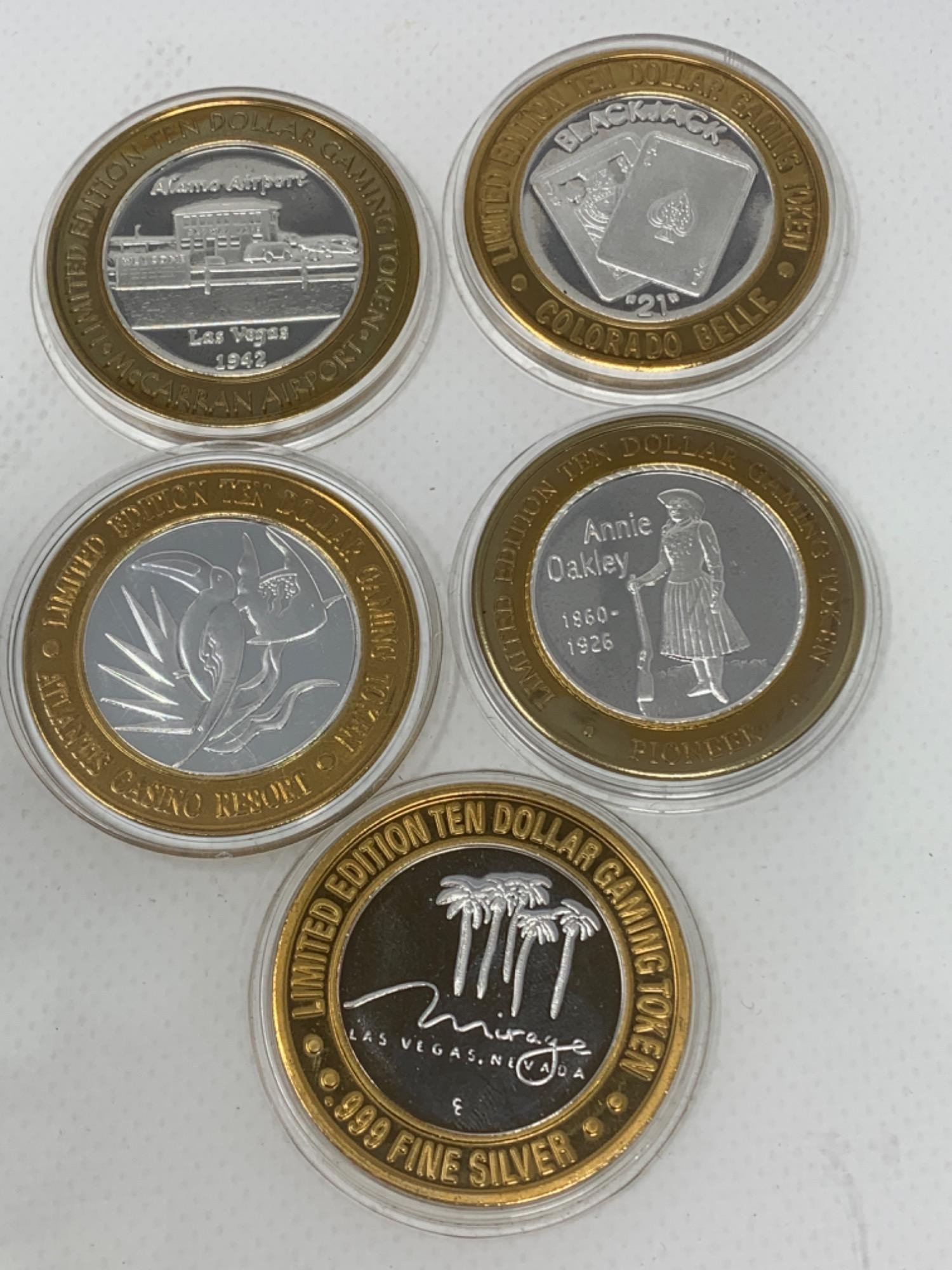 5 gaming tokens. .999 Silver centers. Stored in plastic cases. Atlantis, Pioneer, Mirage, Colorado Belle and Alamo airport casinos. Weight is 112g. Limited edition $10 gaming token. One has damage on it from a burn possibly.