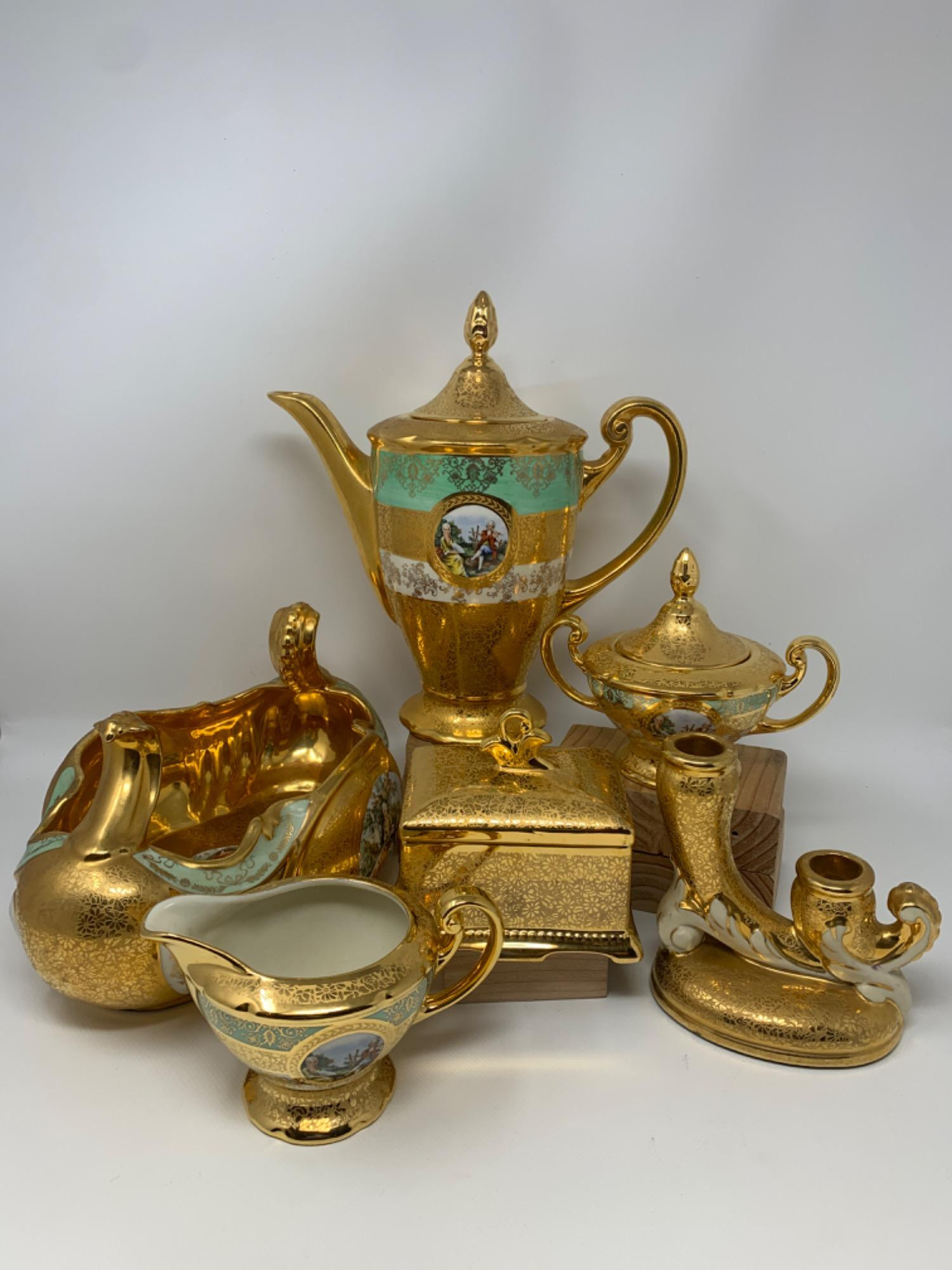 Dimensions of bowl 12 inches long, 8 inches wide. Coffee pot is 11.5 inches tall, 10 inches wide. 24 karat gold China service. Creamer, sugar bowl, candlestick holder. Serving bowl and coffee pot. Lidded box. Le Mieux china with 24k gold and platinum. Colonial detail.