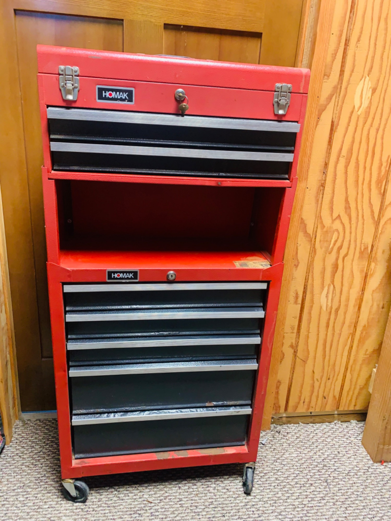Bottom tool chest dimensions are 22.5 inches long, 13.5 inches wide, 29 inches tall. Removable top tool chest dimensions are 19 inches tall, 22.5 inches long, 10 inches wide. Key sets for each piece. Contents included. See pics.